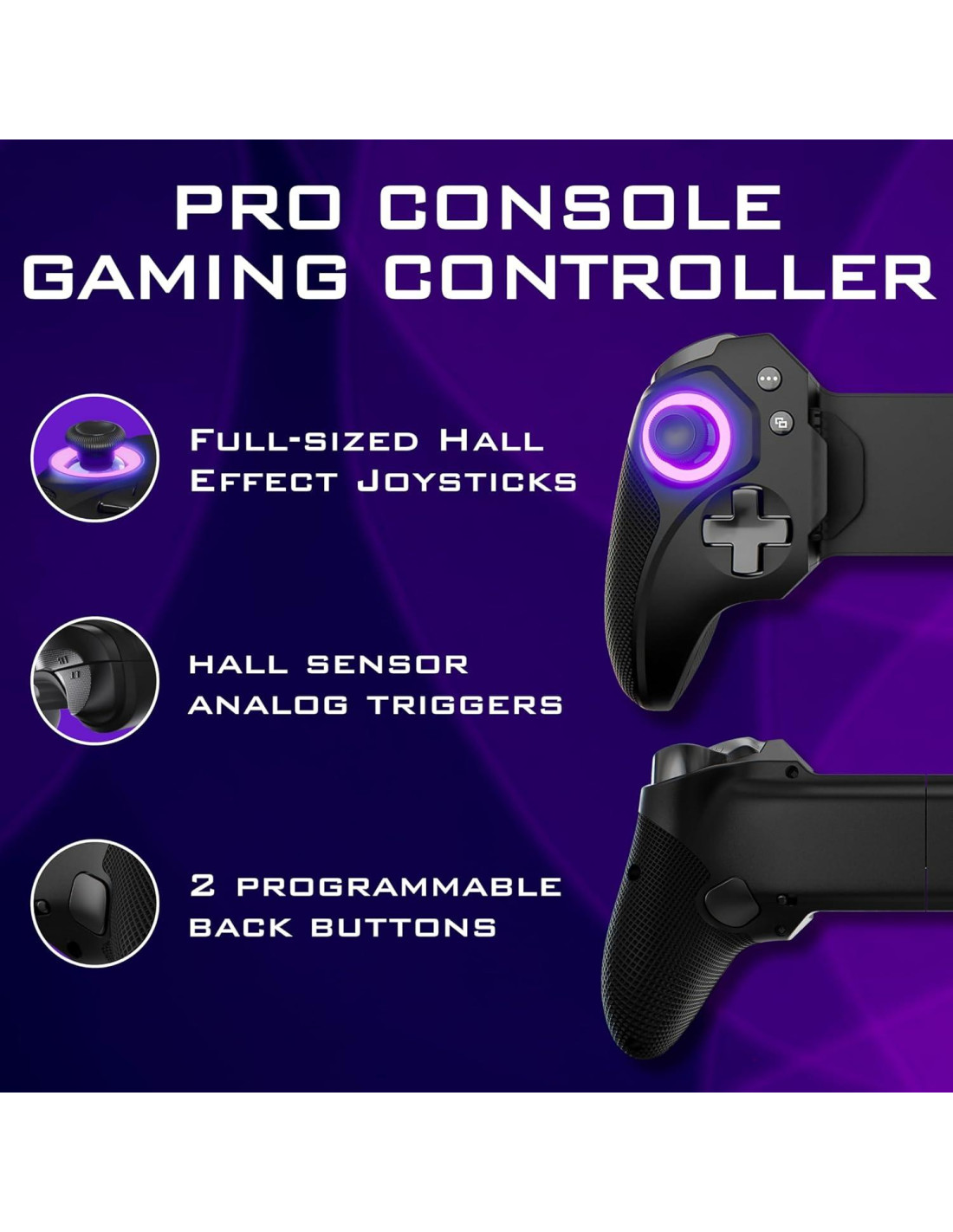- LATENCIA ULTRA BAJA: Controlador de juegos móvil telescópico profesional con tecnología de sensor hall - Equipado con joysticks y gatillos de efecto Hall y un tiempo de respuesta de latencia ultra baja de 1ms con 2 botones traseros programables y carga a través de pasaje, convirtiéndolo en el mejor Controlador de Juegos para iPhone y Controlador de Juegos para Android.