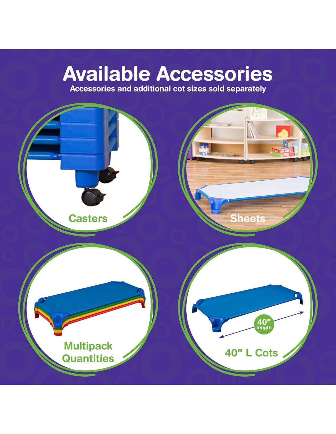 Después de largas horas de juego o aprendizaje, las camas apilables Sprogs para guarderías brindan a sus pequeños el lugar perfecto para acurrucarse y relajarse para una siesta segura. Estas camas para dormir amigables para los niños están diseñadas con cuidado para garantizar una superficie cómoda para la siesta para los preescolares y los bebés somnolientos, lo que las hace ideales para aulas, centros de cuidado infantil o cualquier habitación de su hogar. Para una conveniencia óptima en el aula, las esquinas de copolímero en cada cama se anidan juntas de manera ajustada para permitirle apilarlas ordenadamente hasta 24 de alto para un almacenamiento compacto después de la siesta, y las ruedas (se venden por separado) se pueden adjuntar a la parte inferior de las camas para simplificar el montaje y la limpieza. El duradero tejido de malla no inflamable con un recubrimiento de vinilo hace que la limpieza sea muy fácil: simplemente frote la cama con una esponja húmeda y jabonosa y séquela. Construidas con un resistente marco de acero de calibre 18, estas camas para la siesta soportan años de uso intensivo y soportan hasta 68 kg, y están respaldadas por una garantía de 20 años. Cada cama para niños certificada Greenguard Gold es fácil de ensamblar y mide 132 cm de largo x 58 cm de ancho x 13 cm de alto para encajar ordenadamente en aulas o hogares sin ocupar demasiado espacio.
