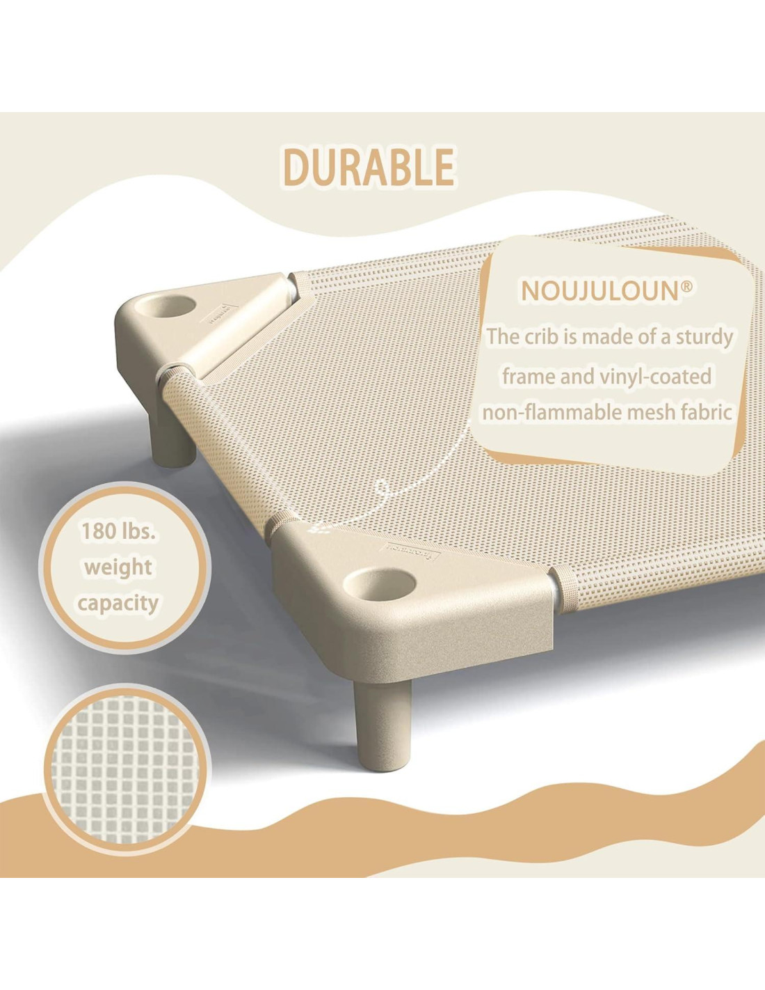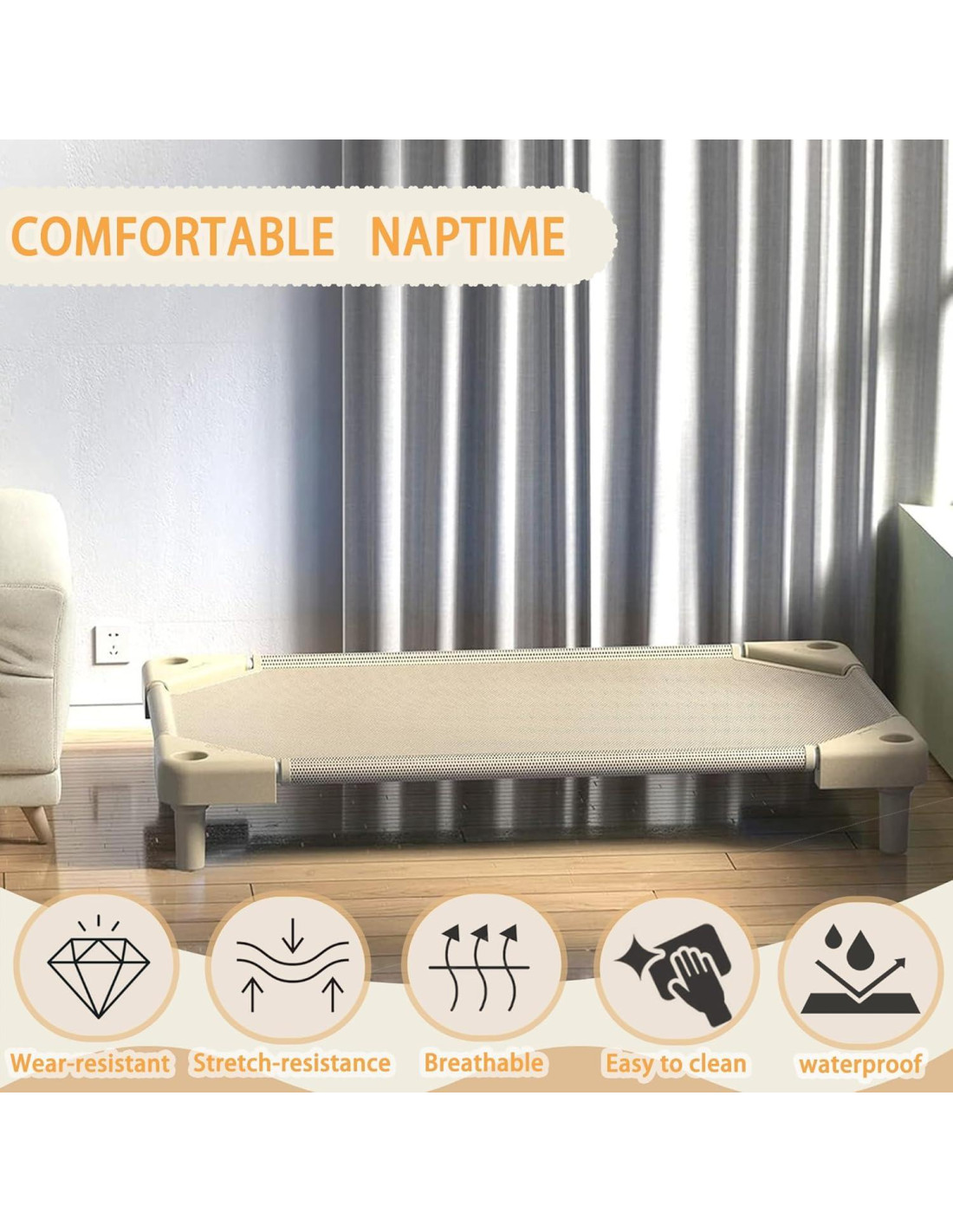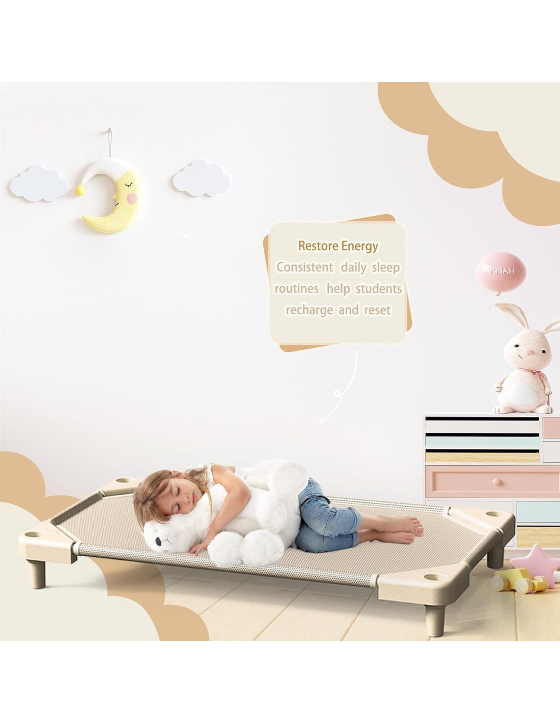 - Camas de siesta mejoradas. Las camas para preescolar NOUJULOUN, hechas de nuevos materiales, ofrecen un rendimiento superior en comparación con las camas de tubo de acero tradicionales: son 100% a prueba de óxido y resistentes a la deformación. Las esquinas reforzadas de polipropileno (PP) pueden soportar pesos que superan los 81.65 kg. Además, las patas de soporte de 15 cm de altura y la superficie de malla transpirable, resistente a estiramientos, aseguran que los niños permanezcan cómodos e higiénicos durante el descanso.