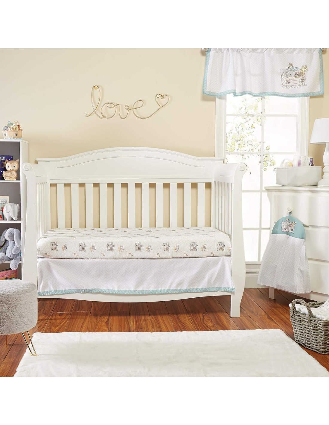 - UN ORGANIZADOR DE PAÑALES COLGANTE: Para una verdadera funcionalidad en la habitación de tu niño, hemos incluido un organizador de pañales complementario también diseñado en colores claros de azul, gris y blanco y decorado con la imagen del Arca de Noé.