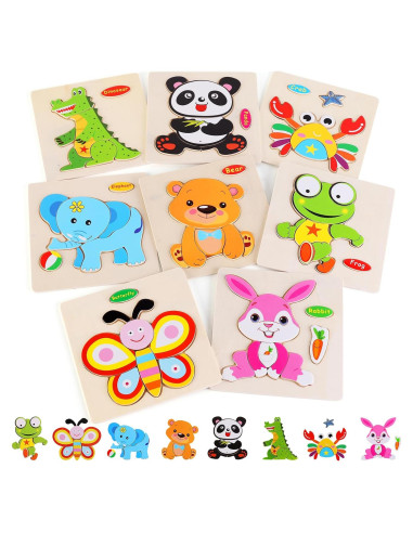 - 8 Adorables Diseños de Animales - Nuestro conjunto de rompecabezas de madera presenta 8 formas de animales vibrantes: cangrejo, oso, elefante, dinosaurio, conejo, panda, mariposa y rana. Los coloridos y lindos personajes animales están diseñados especialmente para atraer la atención de los niños pequeños y despertar su interés en aprender a través del juego.