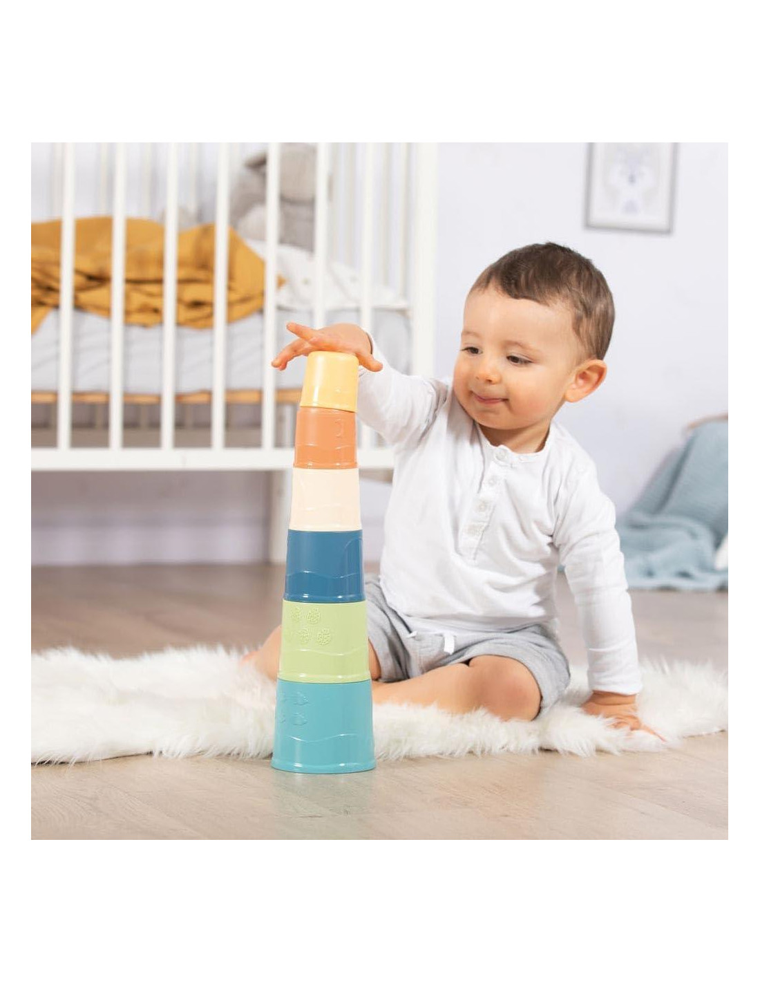 Paquete de 6 tazas apilables Little Smoby Green (altura 40 cm). El bebé podrá desarrollar sus habilidades motoras finas, su reconocimiento de colores y formas con los íconos grabados en cada taza. Hecho de 90% plástico de origen vegetal (biosourcido) a base de caña de azúcar. Producto 100% reciclable. Empaque reciclado. Desde 12 meses - Hecho en Francia.
