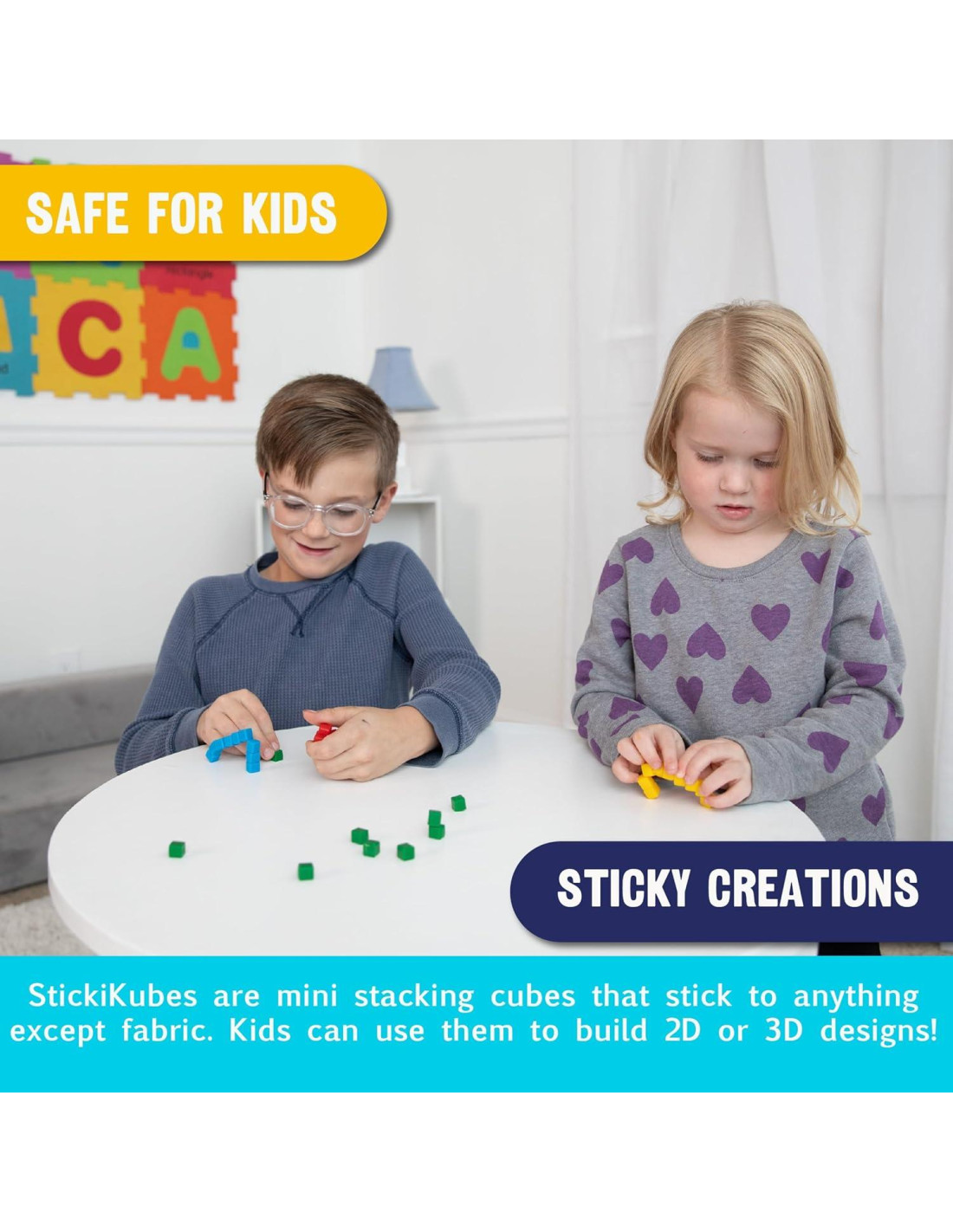 - CREACIONES ADHESIVAS: StickiKubes son mini cubos apilables que se adhieren a cualquier cosa excepto tela. ¡Los niños pueden usarlos para hacer sus propios diseños personalizados en 2D y 3D, así como para decorar cualquier otra cosa en la casa, oficina o aula!