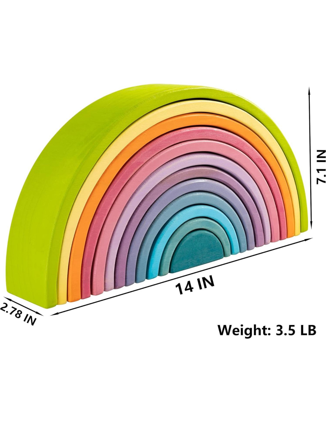 - Tamaño Extra Grande - El apilador de arcoíris de madera grande de 12 piezas anidadas mide 35.56 cm de largo x 7.06 cm de ancho x 17.78 cm de alto. Peso del paquete: 1.71 kg. Edad aplicable: 36 meses en adelante