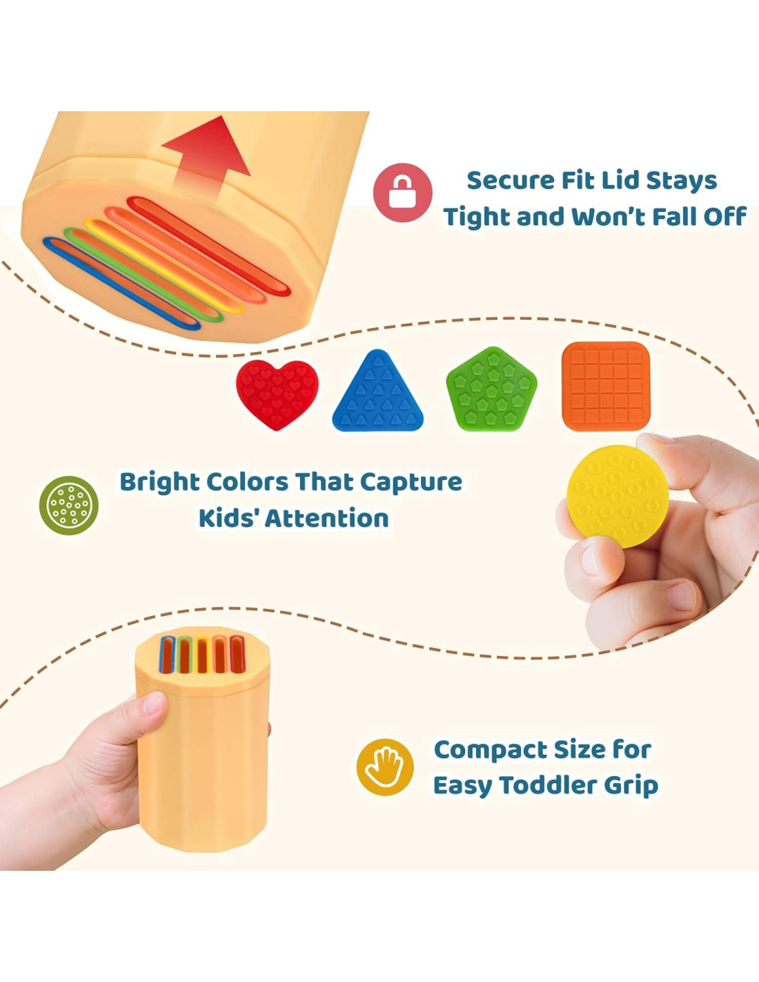 - Materiales Seguros y Cierre de Tapa Seguro: Hecho de silicona amigable con la piel y de grado alimenticio que es libre de BPA, duradera y suave al tacto. Las tapas ajustadas cierran firmemente para mantener todas las piezas de forma segura en su interior, sin deslizamientos ni piezas perdidas, lo que lo hace perfecto para el tiempo de juego en casa o en movimiento. Fácil de limpiar con un rápido paño o enjuague.