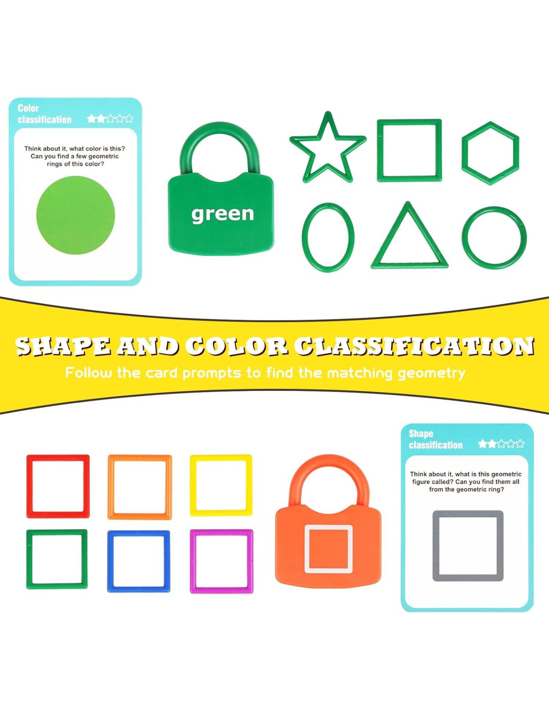 - Kit de Aprendizaje Integral: Sumérgete en la educación con nuestro conjunto todo incluido que presenta 6 cerraduras cautivadoras. Cada cerradura muestra nombres de colores y formas, mientras que las 6 llaves correspondientes presentan formas distintas. Con 36 formas de aprendizaje vibrantes en colores variados y 60 tarjetas interactivas, los niños están empoderados para emparejar llaves con formas, desbloqueando un mundo de logros.