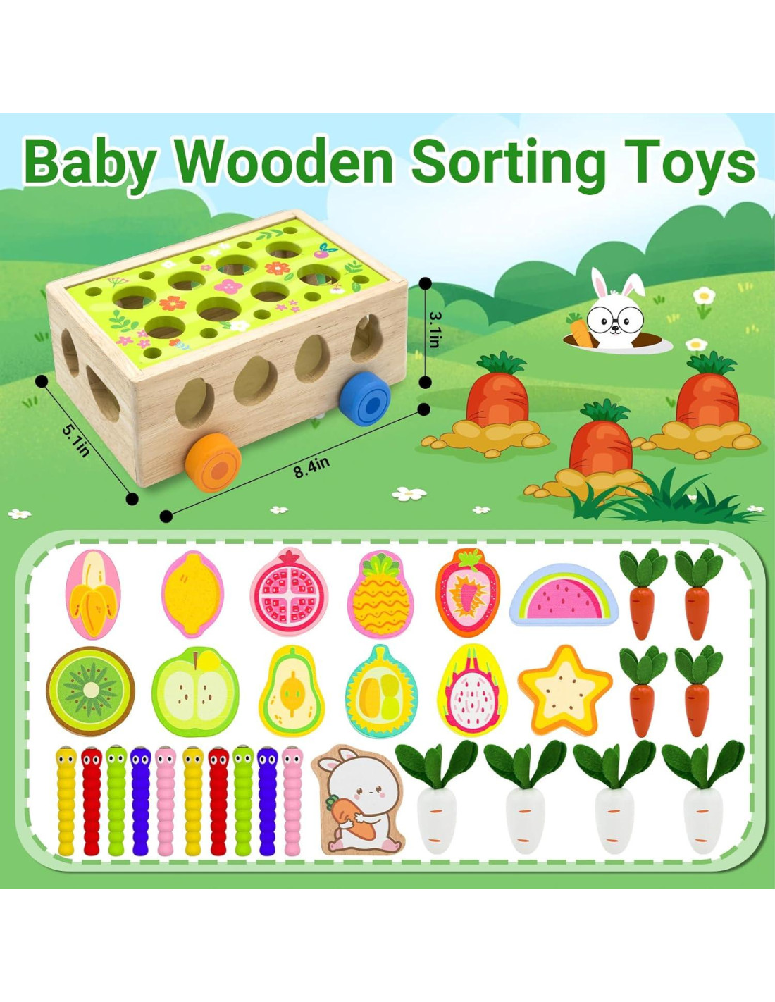 - [Juguete de Puzzle de Forma de Madera] Nuestros juguetes educativos de aprendizaje incluyen: coche de madera*1, zanahoria blanca*4, zanahoria*4, oruga*10, fruta*12 y conejo magnético*1.