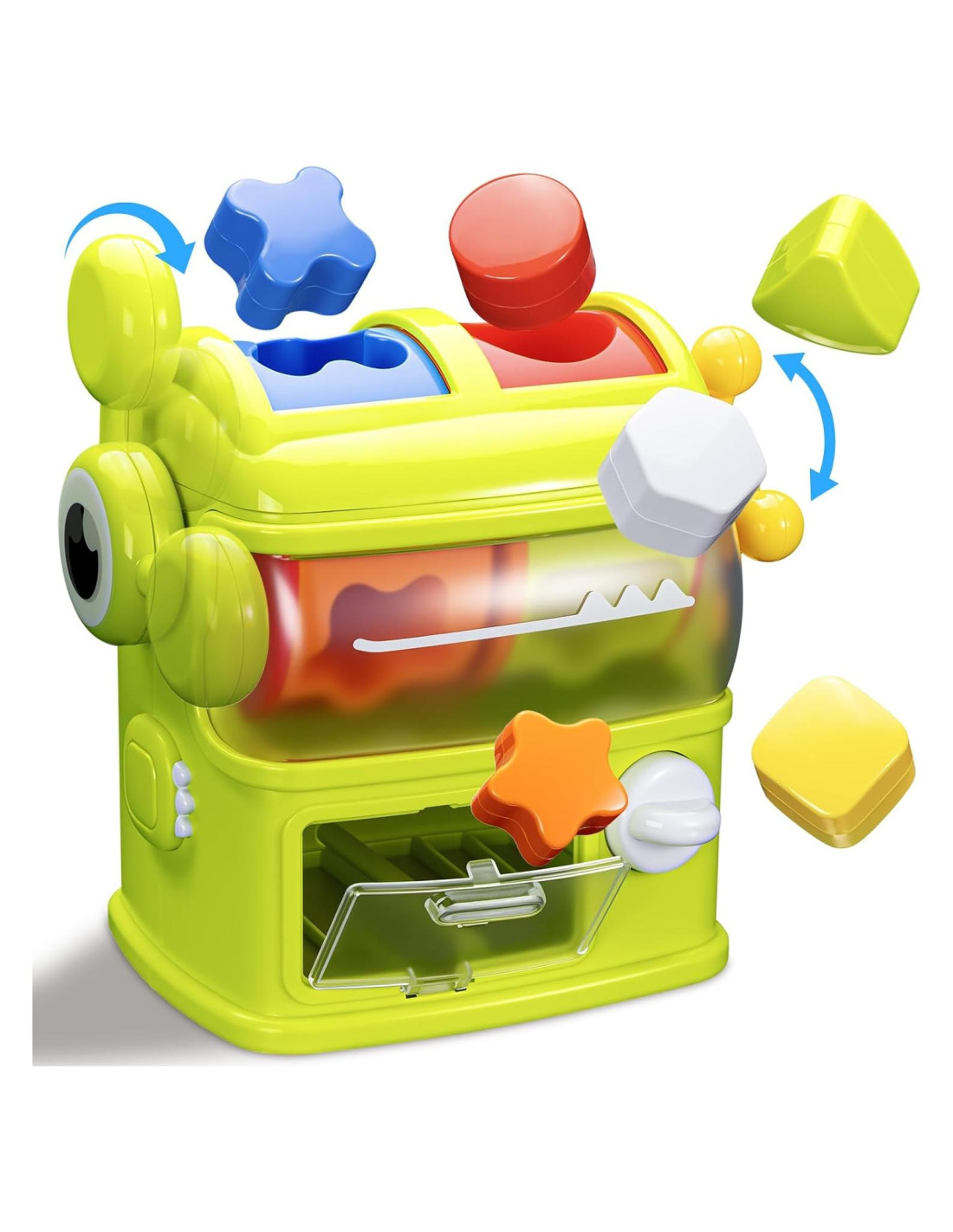 - [Alegría Incesante] Cuando los niños pequeños tiran de la palanca o giran el volante, los bloques de forma caerán en el compartimento de almacenamiento de abajo. Al girar la perilla para abrir la tapa abatible, los pequeños pueden sacar los bloques y disfrutar de la diversión de clasificar formas una vez más