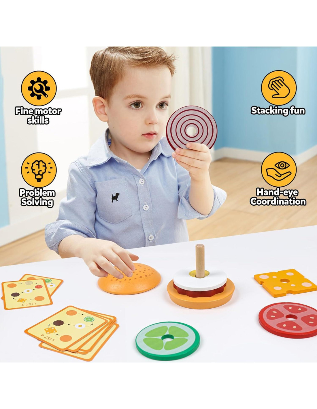 - Juguetes de Apilamiento para Niños Pequeños: Con colores vibrantes y una hamburguesa realista, los Juguetes de Clasificación y Apilamiento de Hamburguesas de Madera Kizh proporcionan una experiencia de juego atractiva e interactiva. Los niños pueden crear sus propias combinaciones de hamburguesas y pretender ser pequeños chefs.