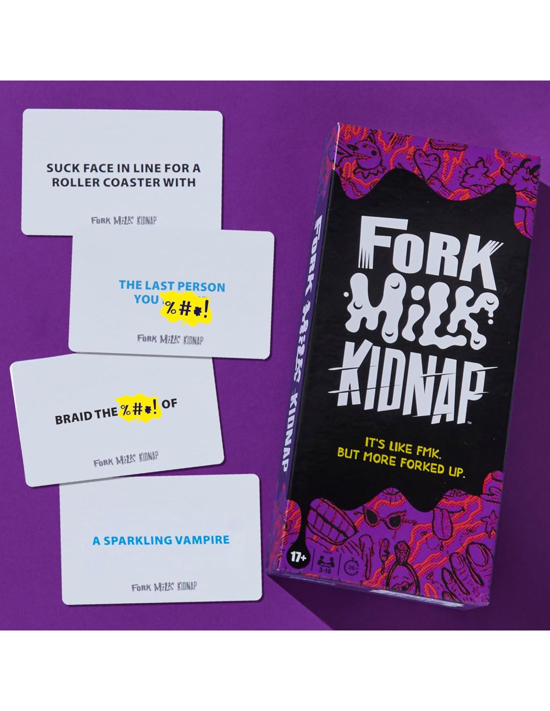 Es como ese juego Tenedor, Casarse, Matar, pero tus elecciones son más retorcidas. El juego de fiesta Secuestro de Leche con Tenedor es el juego NSFW solo para adultos que hará que tú y tus amigos tomen decisiones cuestionables. En cada ronda, un jugador voltea 3 cartas de Acción y 3 cartas de Objeto. Luego, todos deciden en secreto qué Objeto emparejarían con cada Acción. Por ejemplo, ¿a quién le darías un baño con la lengua? ¿A los 7 enanitos, al Hombre de Florida, o al jugador de tu elección? Todos toman turnos revelando sus 3 emparejamientos y explicando su razonamiento. Espera algo de charla. Y juicio. Los jugadores anotan un punto cuando sus emparejamientos coinciden con las respuestas de la mayoría. ¡El primero en anotar 5 puntos gana! ¿Buscas juegos divertidos para romper el hielo para adultos o juegos de fiesta para adultos para la noche de juegos? Para mayores de 17 años, el juego Secuestro de Leche con Tenedor es un divertido juego para adultos para fiestas, noches de chicas y más. Secuestro de Leche con Tenedor, Hasbro Gaming, y todas las propiedades relacionadas son marcas registradas de Hasbro.