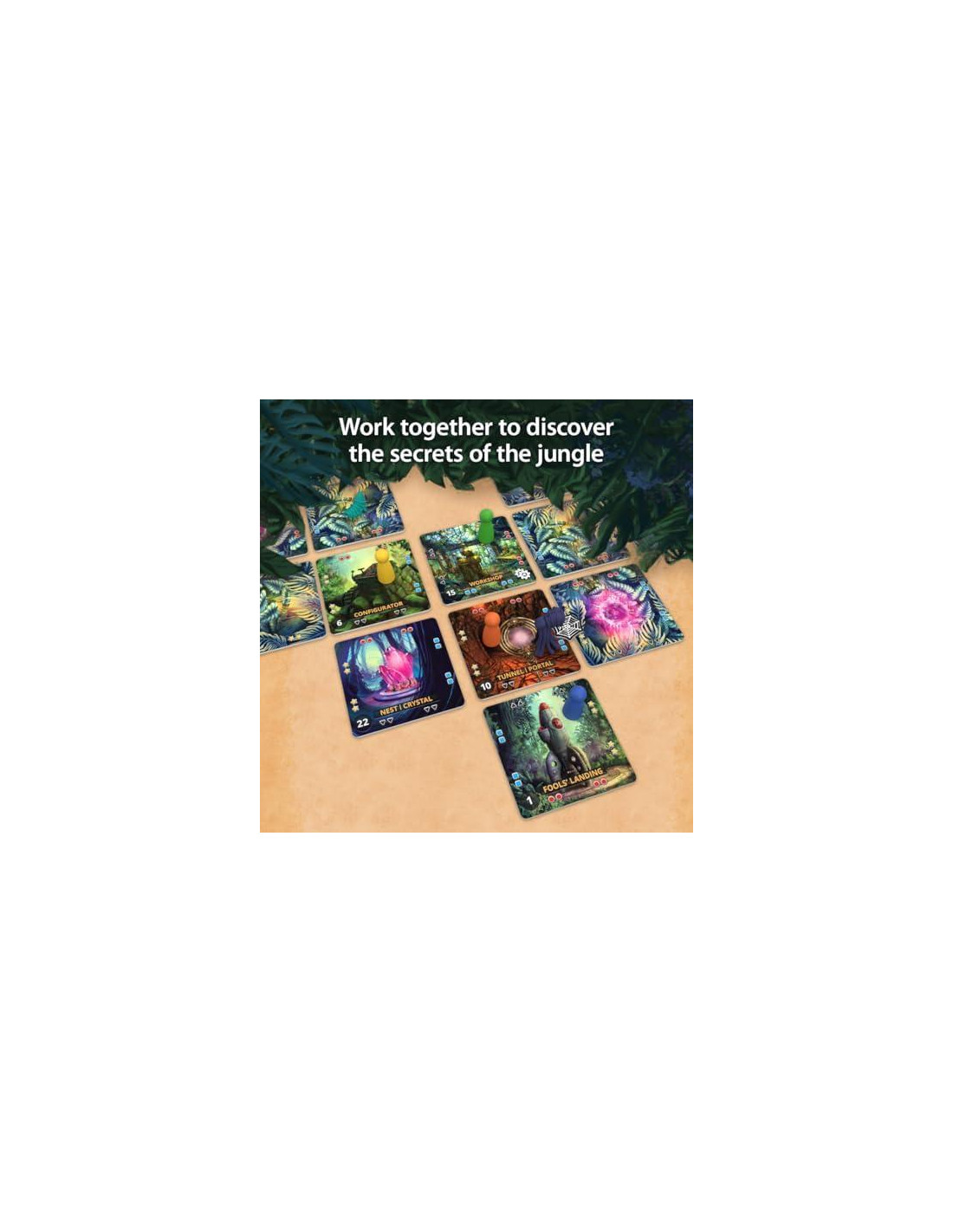 - JUEGO DE ESTRATEGIA COOPERATIVO: Trabaja en equipo para descubrir los secretos de la jungla, posicionar los cristales, activar el portal y escapar.