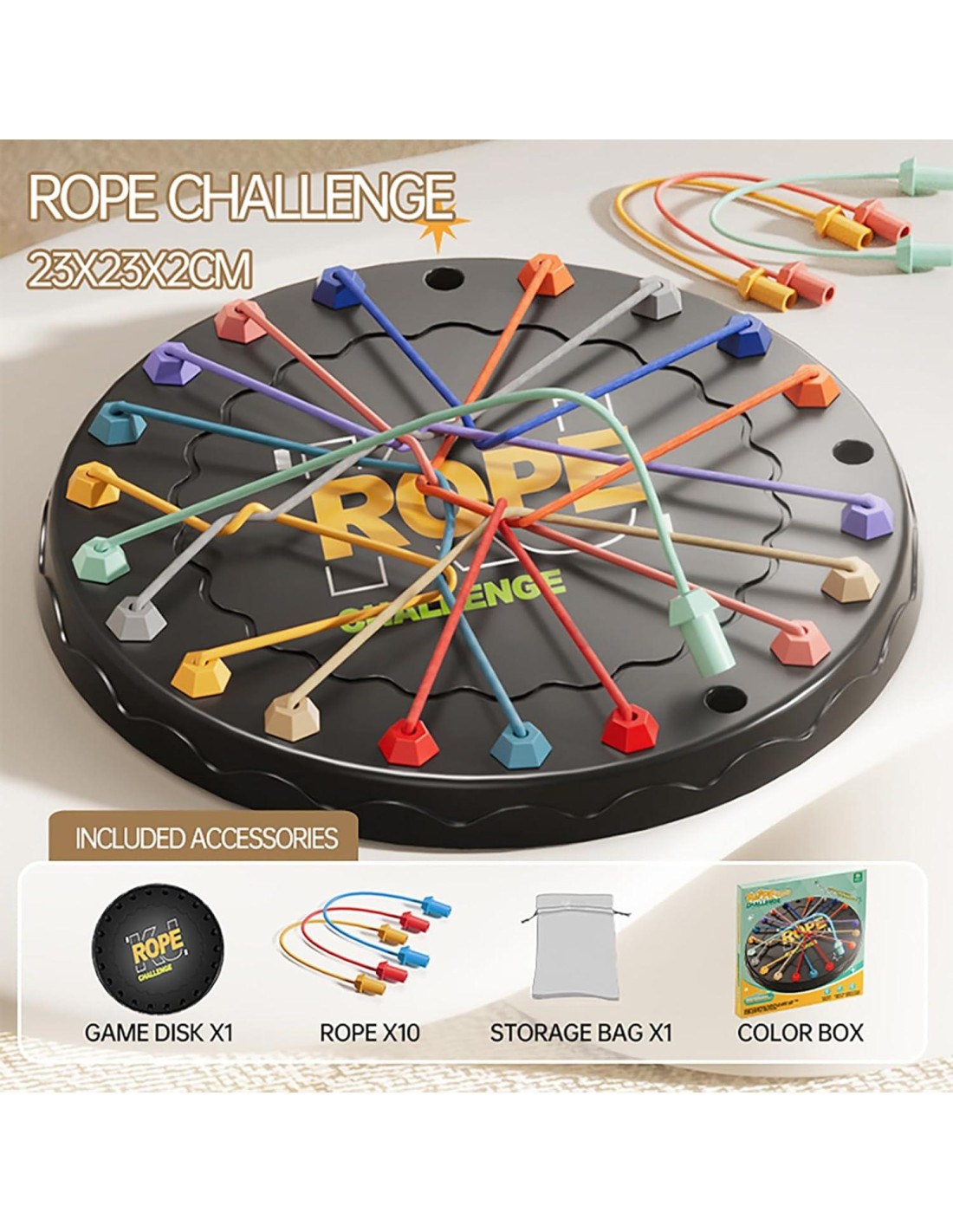 - Cómo Jugar: "Inserta ambos extremos de 10 cuerdas vibrantes (con puntas de plástico) en los 22 agujeros del tablero, torciendo en nudos o cruces. Ajusta la dificultad con 3-10 cuerdas. Los jugadores mueven las puntas de las cuerdas SOBRE otras-nunca debajo-para vaciar agujeros. Retira las cuerdas desenredadas y limpia todo para ganar-Para instrucciones detalladas, mira el video: Cómo Jugar - Desafío de Desenredo de Cuerda."