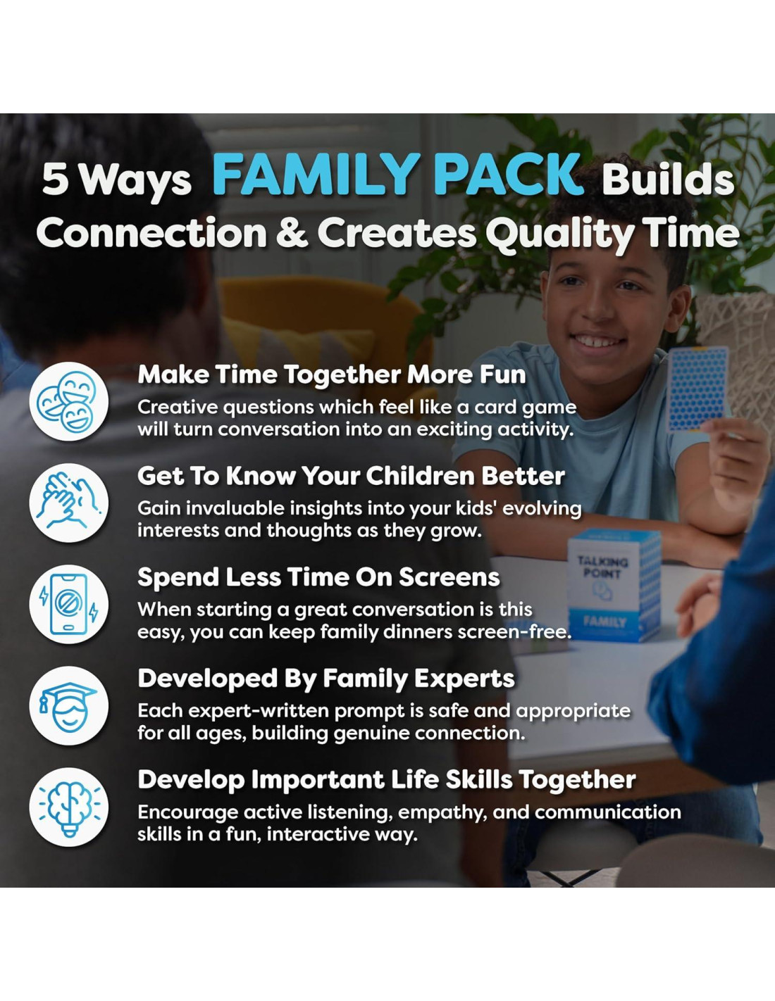 - PARA TODA LA FAMILIA - Cada mazo de tarjetas contiene 4 categorías: 'Conocerte', 'Tiempo en Familia', 'Qué Te Hace Ser Tú' y 'Divertido y Aleatorio'. Tomen turnos para preguntar y responder, y no olviden hacer preguntas de seguimiento para profundizar aún más. Todo el contenido está cuidadosamente diseñado para ser apto para toda la familia, apropiado para la edad y seguro para ayudar a todos a unirse a la diversión