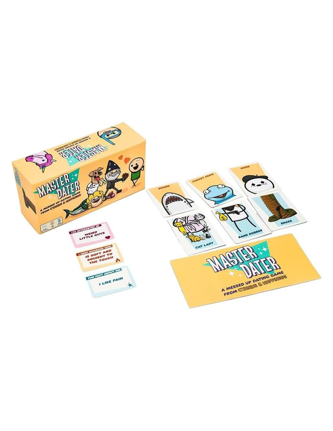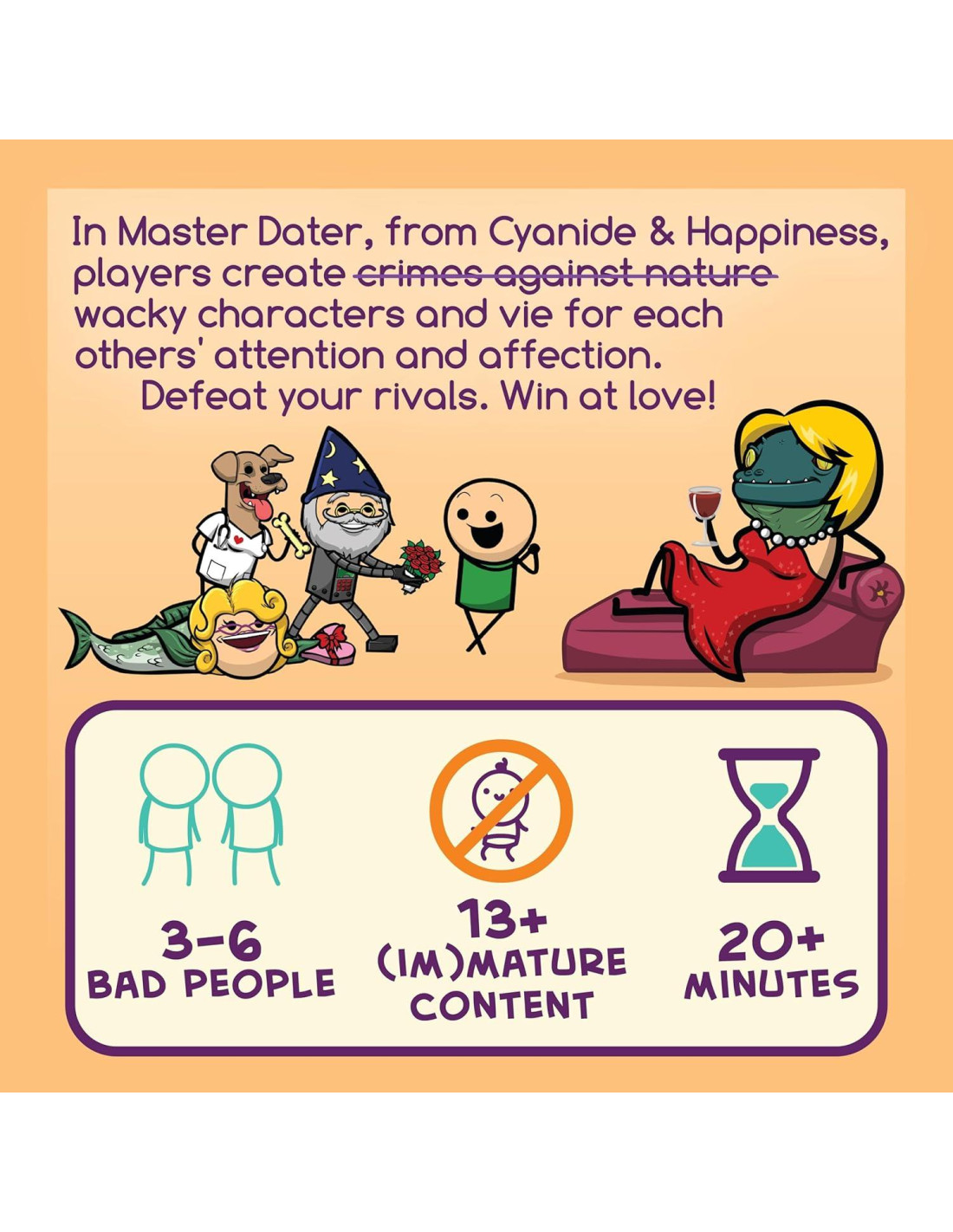 En Master Dater, el más nuevo juego de cartas de Cyanide & Happiness, los jugadores compiten por la atención y el afecto de los demás creando citas perfectas y horribles que se adaptan a intereses de citas muy específicos. Combina una cabeza y un cuerpo en una combinación perfecta y argumenta tu camino hacia el corazón del hermoso soltero. ¡Derrota a tus rivales, gana en el amor!