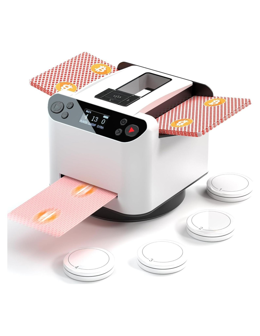 - Equipado con un motor de alta velocidad, la máquina baraja una baraja de cartas en tan solo 7 segundos y transiciona automáticamente al reparto, facilitando un juego rápido ya sea en un torneo de póker o en una noche de juego casual.
