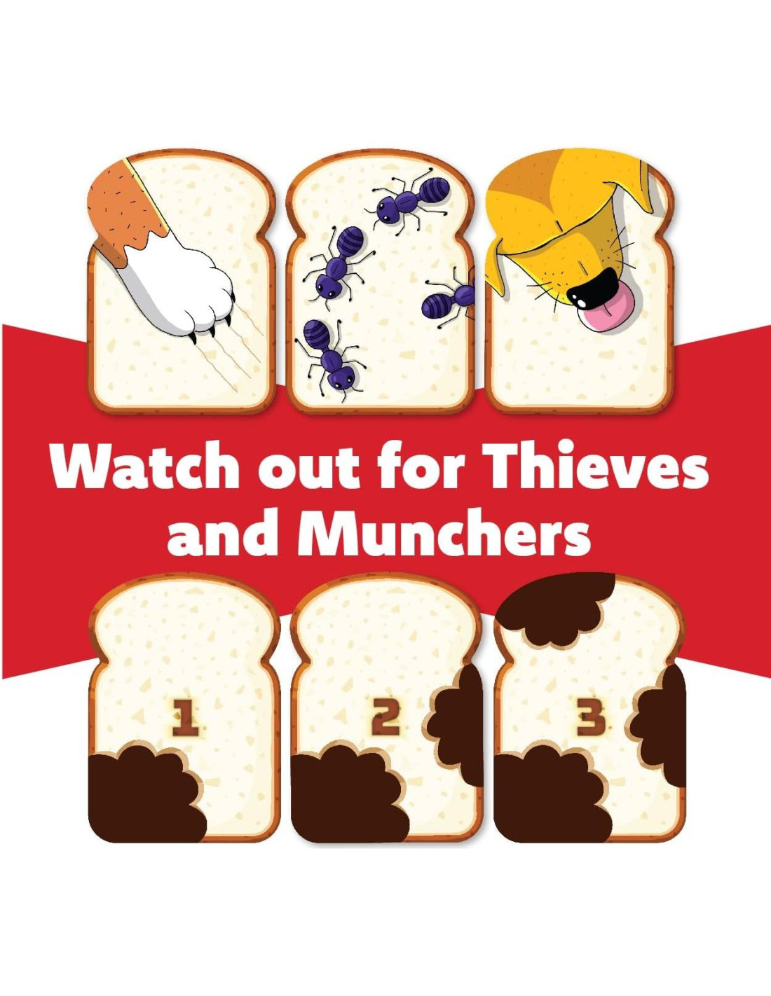 - Cartas que están troqueladas para parecer rebanadas de pan cubiertas con elementos de sándwich, ladrones de sándwich y comedores de sándwich.