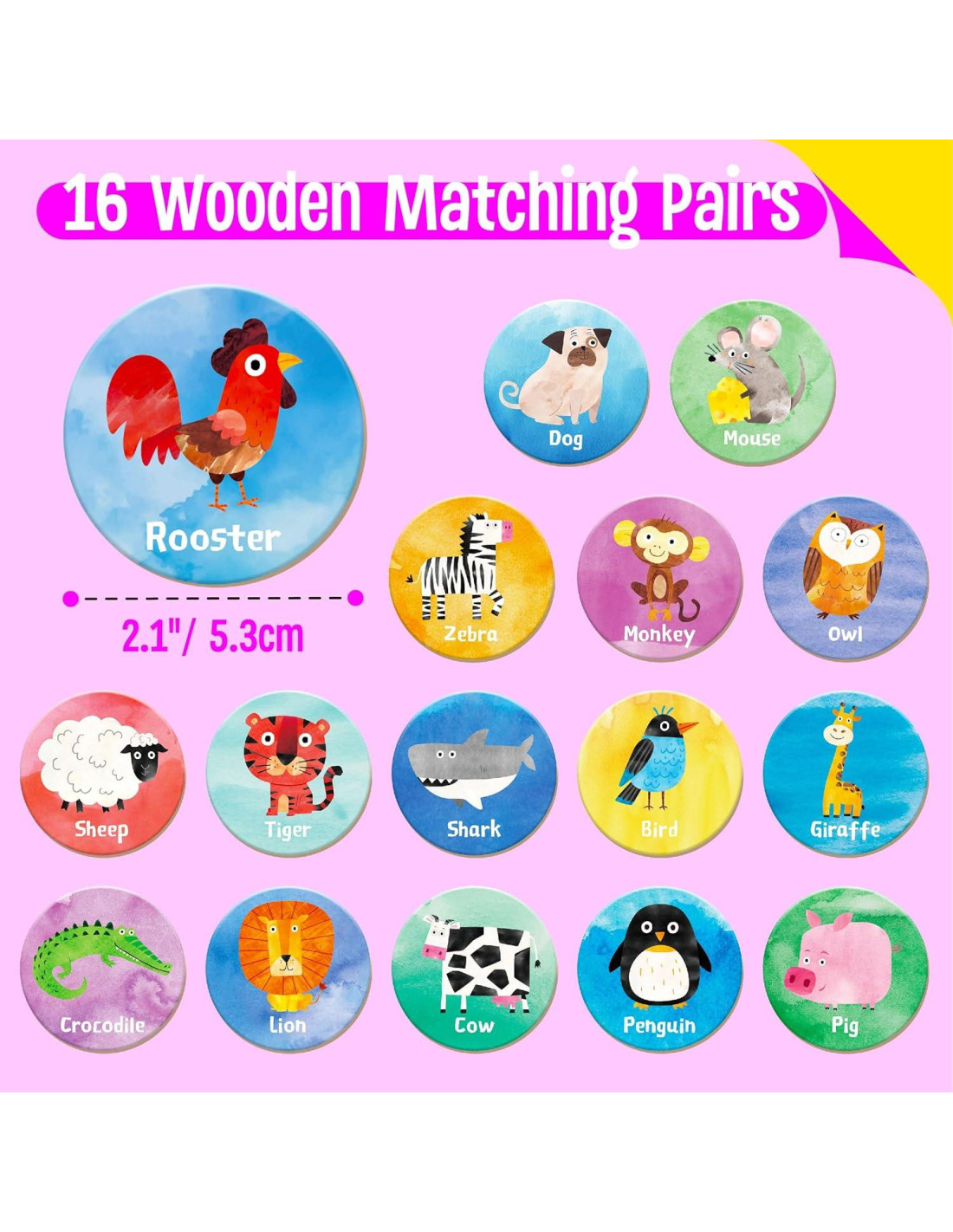- Paquete de Valor: Viene con 32 fichas de madera en una caja, una forma divertida y atractiva para que los niños desarrollen sus habilidades de memoria y emparejamiento. Es un juego clásico para niños de todas las edades, ayudándoles a aprender a reconocer animales, recordar ubicaciones y mejorar su concentración. Además, jugar en grupo ayudará a mejorar la capacidad de expresión.