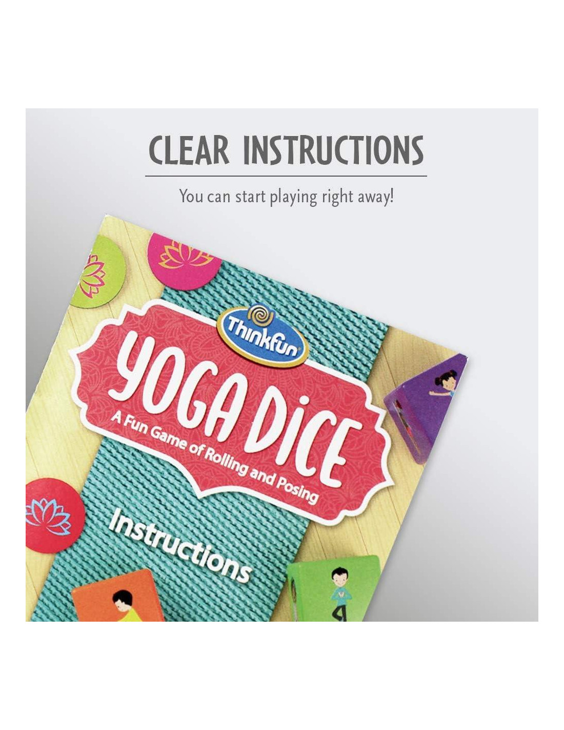 - Lo que obtienes - Los Dados de Yoga vienen con 6 dados de posturas de yoga de seis caras, 6 fichas de postura, 1 dado de respiración de seis caras, 1 ficha de enfoque, 1 pista de juego de esterilla de yoga y una bolsa para llevar el juego.