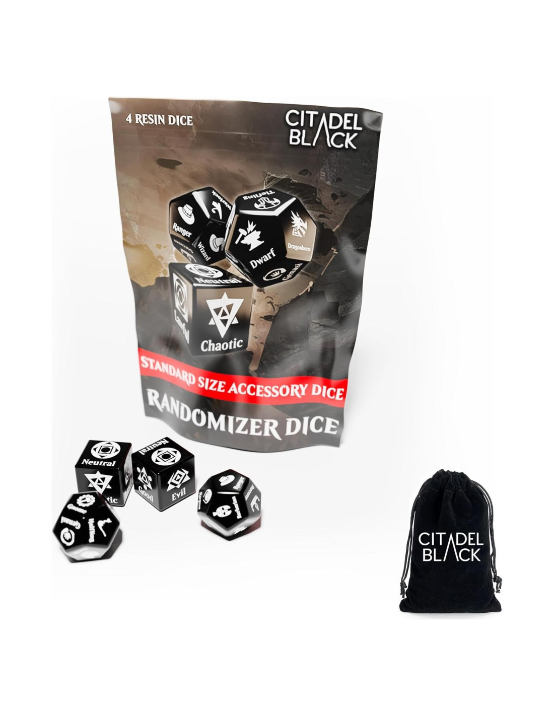 - Juego de dados Randomizador de Personajes incluye 1x Raza D12, 1x Clase D12, 2x Alineación D6
