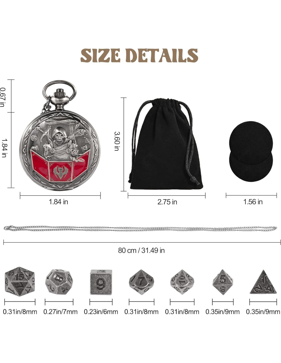 - LO QUE RECIBIRÁS: Juego de 7 dados poliedricos de metal d&d, un estuche de reloj de bolsillo con un patrón de dragón creativo y único, 2 pestañas de reducción de ruido para minimizar el ruido producido por el lanzamiento de los dados, una pequeña bolsa de almacenamiento para un fácil acceso a los dados y una caja negra para todos los pequeños artículos.