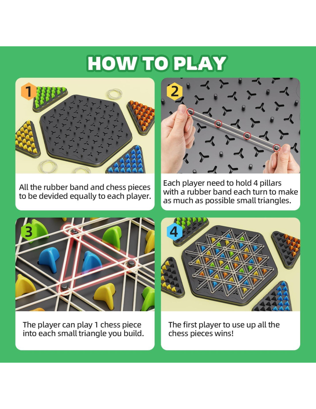 - CONSEJOS PARA GANAR: Este juego de estrategia para niños presenta desafíos territoriales, así que coloca las bandas de goma y trata de crear tantos triángulos pequeños como sea posible. Es el mejor juego de mesa estratégico para niños y niñas mayores de 6, 7 y 8 años