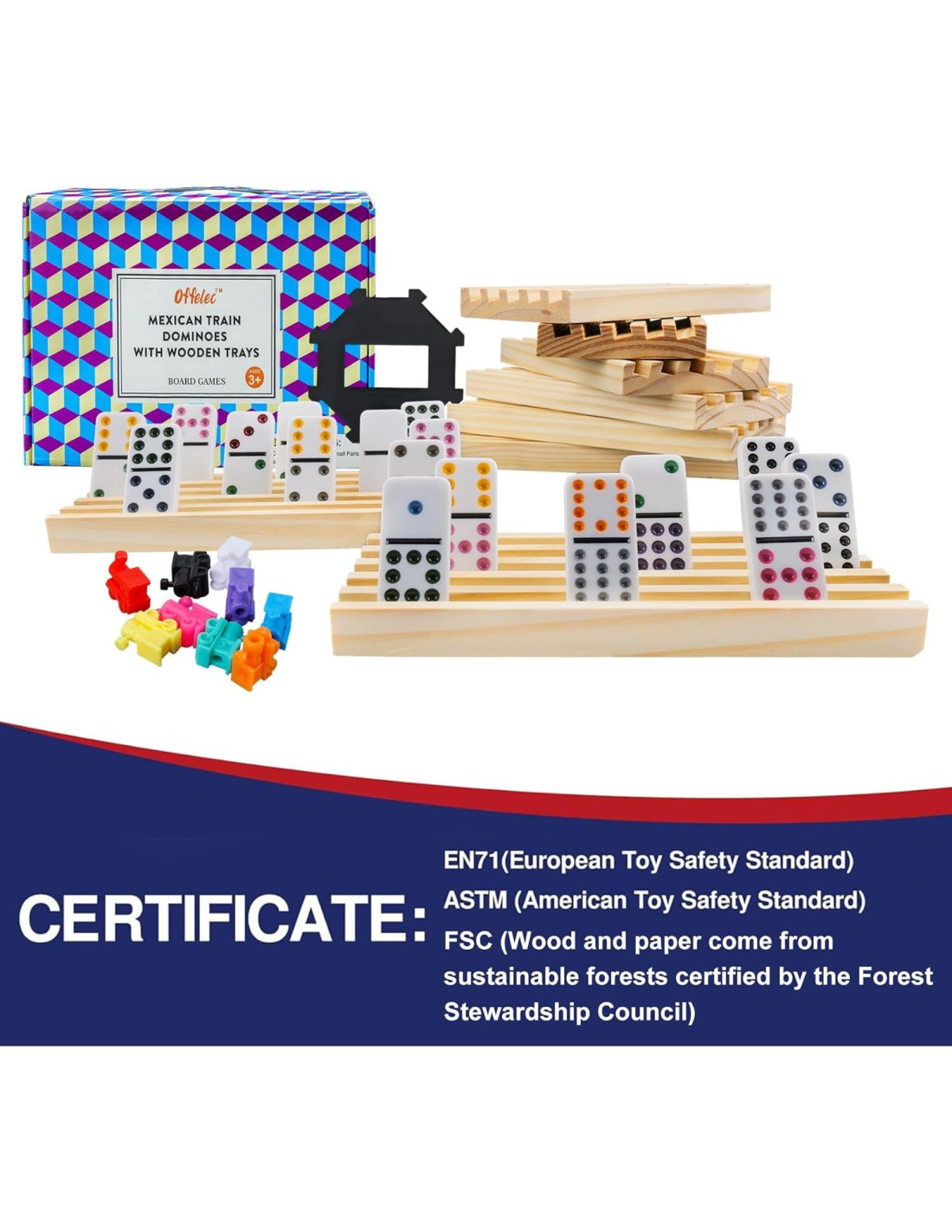 - Seguro, Ecológico y Sostenible: Este set de dominós de tren mexicano ha pasado por pruebas rigurosas para garantizar su calidad y durabilidad. Todos los materiales cumplen con la prueba de seguridad de juguetes EN71 (Norma de Seguridad de Juguetes Europea) y ASTM (Norma de Seguridad de Juguetes Americana), lo que lo convierte en una opción confiable para un uso duradero.