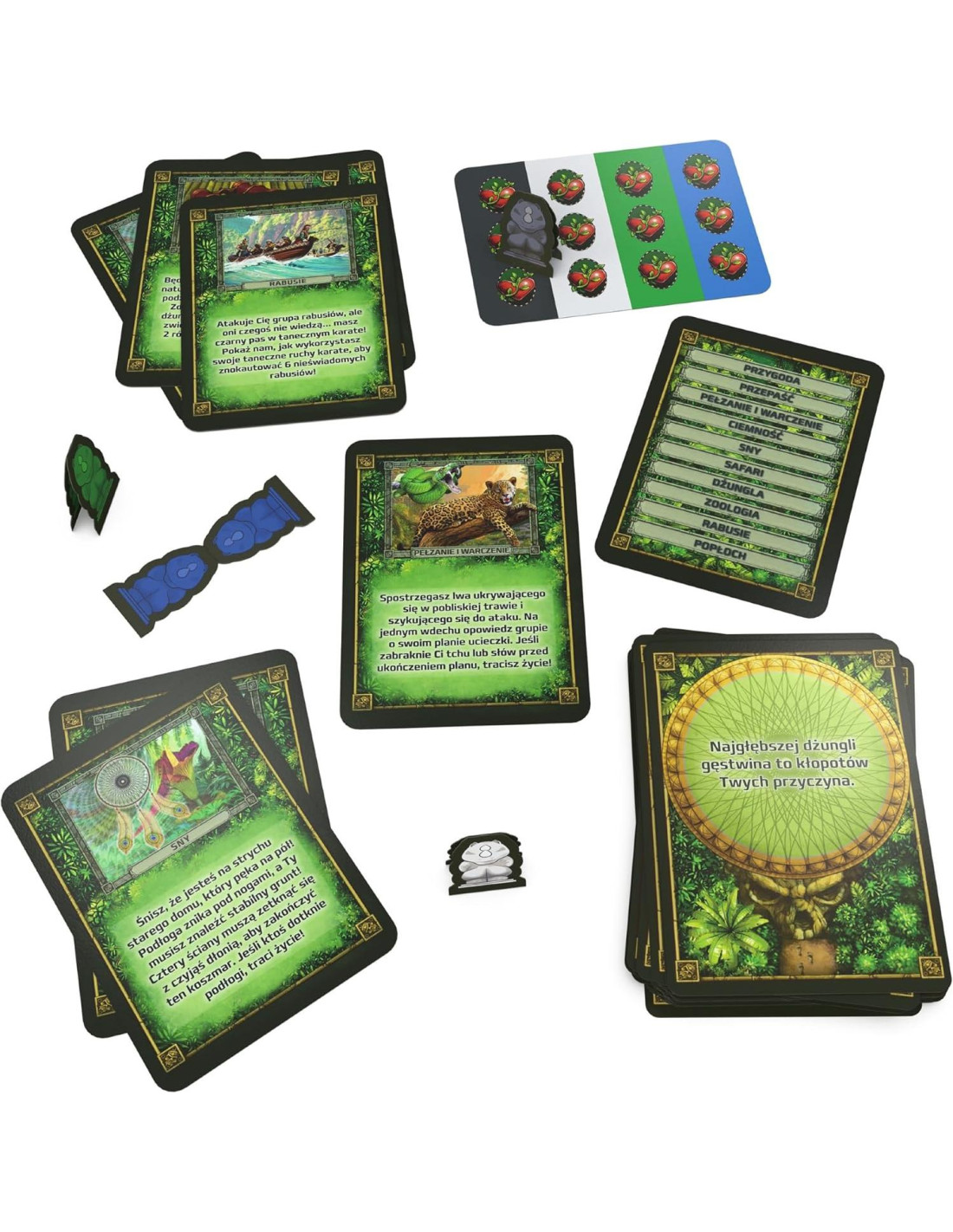 No empieces cuando no estés listo. El juego de cartas Jumanji Jumbo te lleva a ti y a tus aventureros en un viaje a través de la jungla, donde puedes resolver acertijos y superar desafíos sin perder tu vida. Este juego de cartas es fácil de preparar y jugar. Exprime las figuras, dóblalas en forma de tienda y colócalas en el marcador de vida en el color apropiado. Así, cada jugador puede llevar un registro de su nivel de vida. Ideal para los amantes de la película de culto Jumanji, ya sea que prefieras a Robin Williams o a Dwayne Johnson. Coloca una carta de acertijo oculta para cada jugador y divide los desafíos. Supera 10 desafíos y asegúrate de que todos sobrevivan. Un juego para aquellos que buscan una forma... de dejar atrás el mundo diario. Este es un juego de mesa para 2, 3 o 4 jugadores. Independientemente de su edad, adultos, adolescentes y niños a partir de 8 años seguramente se divertirán en una noche familiar con este juego de mesa para fiestas. La clásica película de acción "Jumanji" ahora toma la forma de un excelente juego para adultos o niños. Es un gran juego de viaje, un regalo perfecto o un gran regalo de cumpleaños. No tengas miedo... de jugar Jumanji Jumanji Jumbo!