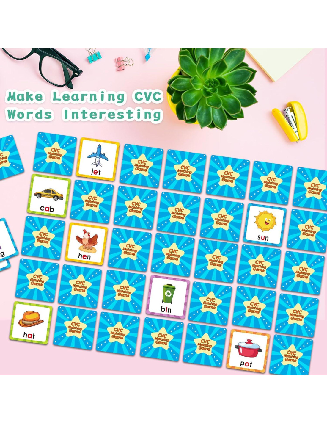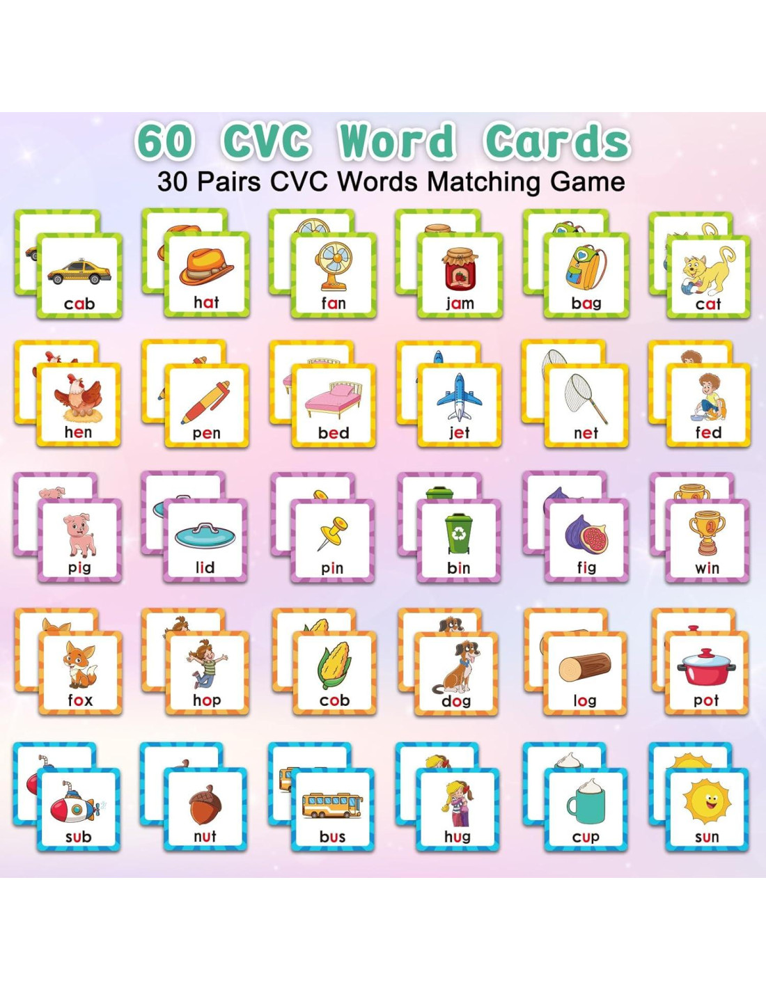 - Atractivos Juegos de Emparejamiento de Palabras CVC para Edades de 2-4: El conjunto de tarjetas CVC incluye 60 fichas de cartón resistentes (30 pares) para que los niños se familiaricen con palabras CVC simples. Este conjunto de tarjetas de palabras CVC es un divertido juego de emparejamiento, mostrando una variedad de palabras CVC de tres letras con patrones vibrantes. Despierta la curiosidad de los niños, expande su vocabulario, mejora su capacidad para reconocer y leer palabras comunes durante el tiempo de juego. Además, jugar en grupo ayudará a mejorar la capacidad de expresión.