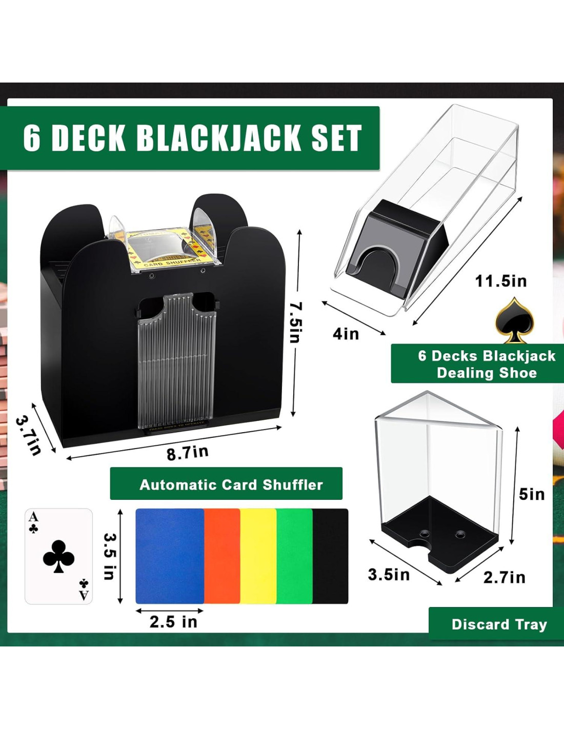 - Set Combo de Blackjack: el barajador automático de 6 mazos funciona con la mayoría de los juegos de cartas como bridge, póker, Texas hold póker y otros juegos de cartas; La bandeja de colección de cartas barajará efectivamente las cartas en unos segundos; Solo inserta las cartas en las 2 aberturas y presiona el botón en la parte inferior del barajador de cartas, barajando rápida y eficientemente; El zapato de blackjack de 6 mazos está hecho de acrílico con bordes suaves y redondeados