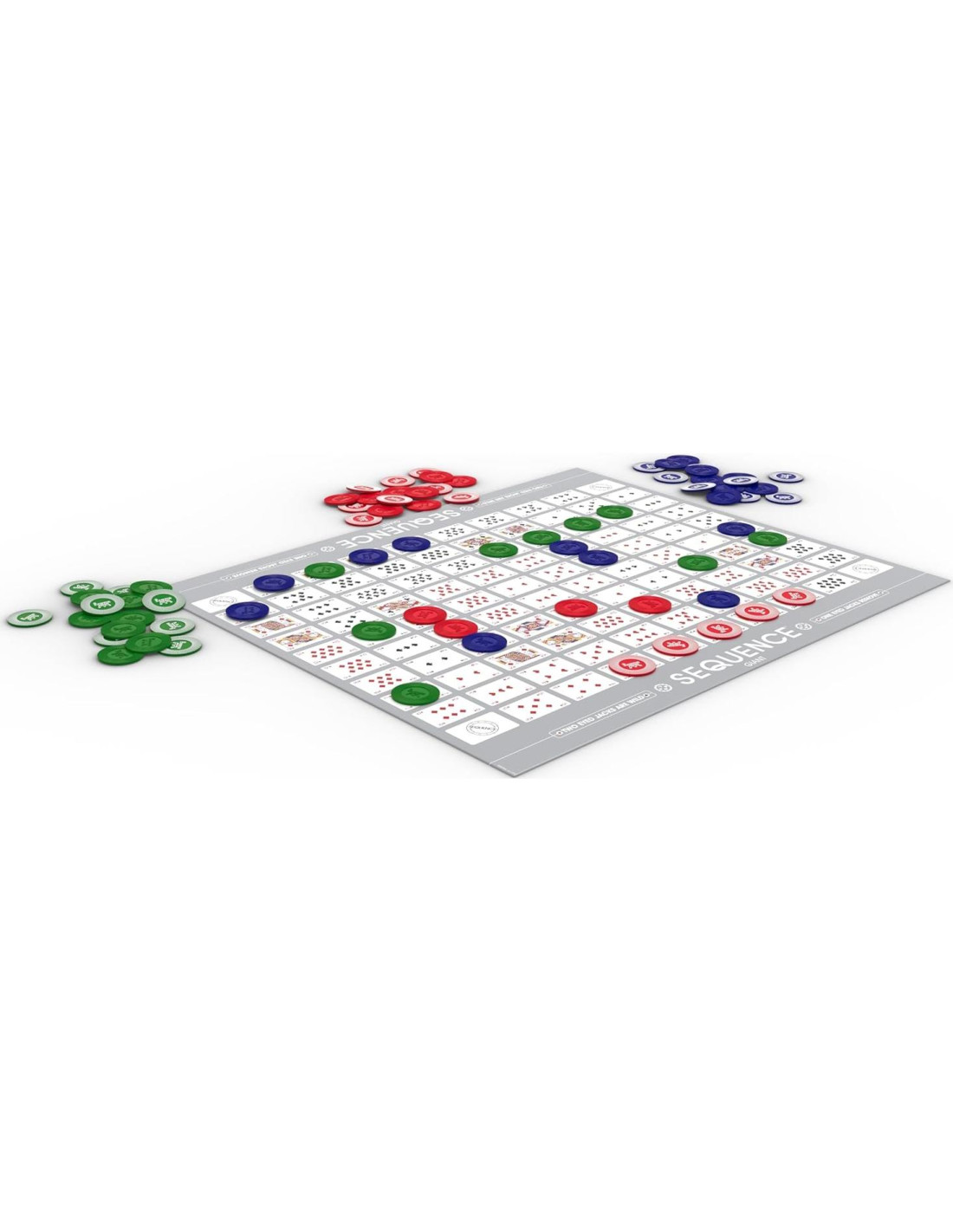 Descripción del producto Es divertido, es desafiante, es emocionante, ¡es SEQUENCE! Juega una carta de tu mano y coloca una ficha en un espacio correspondiente en el tablero de juego. Cuando tienes cinco en fila, es una SEQUENCE. Aprende a bloquear a tus oponentes o a quitar sus fichas, ¡y ten cuidado con los Jacks - son salvajes! Con un poco de estrategia y suerte, ¡serás un ganador! Esta versión gigante de SEQUENCE incluye un tapete de juego acolchado y enrollable (27" x 32" (68.58 cm x 81.28 cm)) - ¡genial para noches de juegos familiares o fiestas! Para 2-12 jugadores, edades 7 y más. Amazon.com Con toques de canasta, rummy y póker, este juego de cartas podría convertirse fácilmente en un favorito familiar de los viernes por la noche. El objetivo del juego es obtener una "secuencia", lo que significa una fila de cinco fichas similares a las de póker en el tapete de juego. El tapete de vinilo en sí (aproximadamente 28 por 32 pulgadas (71.12 cm x 81.28 cm)) muestra filas de cartas de juego boca arriba. Los jugadores colocan sus fichas "coronadoras" sobre las imágenes de las cartas, y pueden establecer secuencias utilizando una cuidadosa estrategia y sabiendo qué cartas de SEQUENCE conservar y descartar. Dado que la previsión, la suerte y los planes de respaldo son las claves para ganar este juego, probablemente sea demasiado sofisticado para niños menores de 7 años. (Pero los más jóvenes pueden unirse a los adultos.) El atractivo tapete y las pilas de fichas coloridas añaden atractivo estético tanto para ancianos como para niños. --Gail Hudson P.when('A').execute(function(A) { A.on('a:expander:toggle_description:toggle:collapse', function(data) { window.scroll(0, data.expander.$expander[0].offsetTop-100); }); }); Desde el fabricante El juego de SEQUENCE es una actividad favorita para la familia y amigos. Hasta doce jugadores pueden disfrutar del juego que combina estrategia y suerte. Juega una carta de tu mano, coloca una ficha en un espacio correspondiente en el tablero de juego. Cuando tienes cinco en fila, es una SEQUENCE. Aprende a bloquear a tus oponentes - quita sus fichas. ¡Ten cuidado con los Jacks - SON SALVAJES! Con un poco de estrategia y un poco de suerte - ¡eres un ganador! Ver más