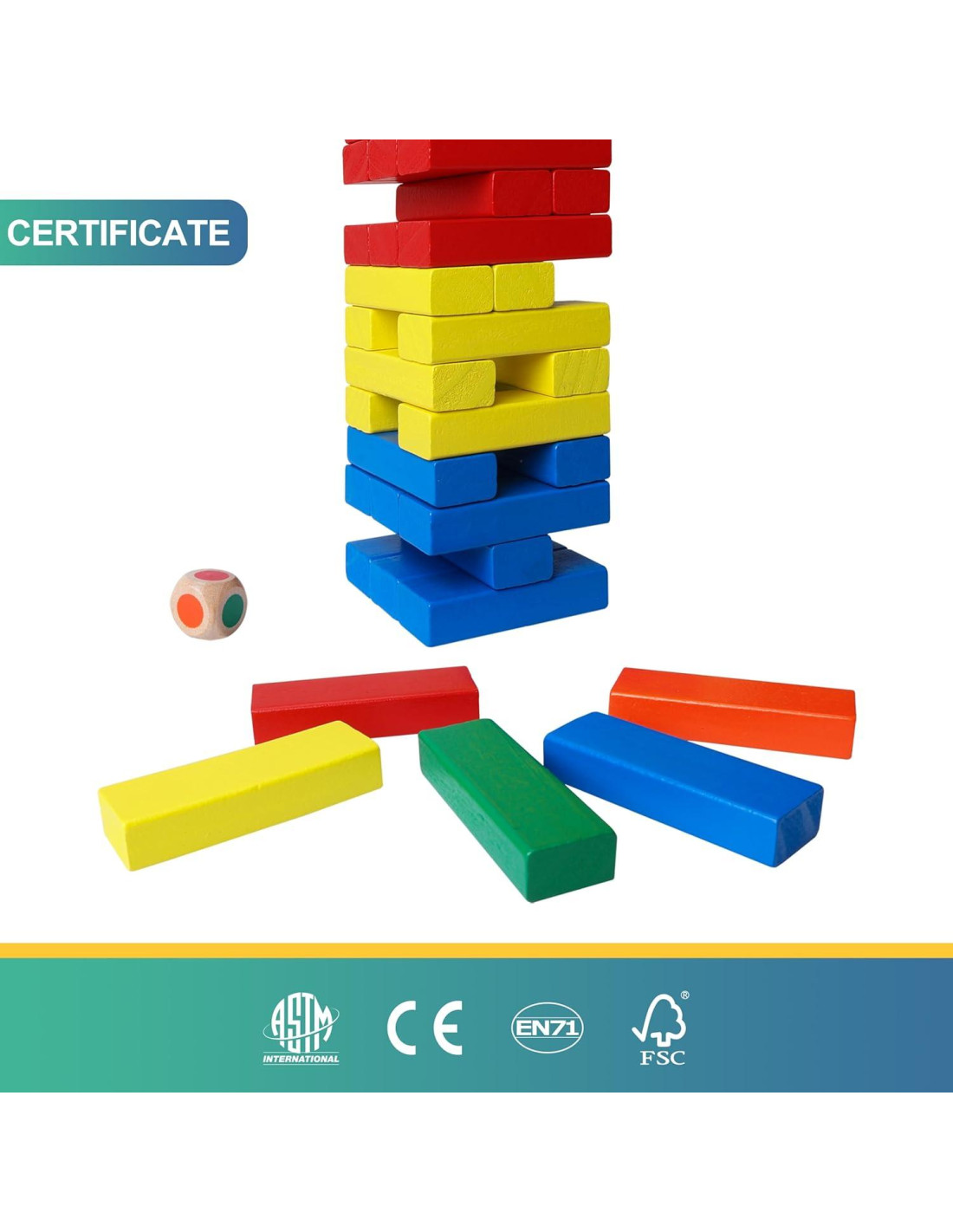 - JUEGO DE APILAMIENTO CLÁSICO. El juego de bloques de madera está hecho de madera de primera calidad que proporciona durabilidad a largo plazo y no se dañará después de cada caída de la torre. Construye la torre, lanza el dado y retira el bloque correspondiente. Promueve la coordinación, la coordinación mano-ojo y las habilidades motoras finas para niños de todas las edades.