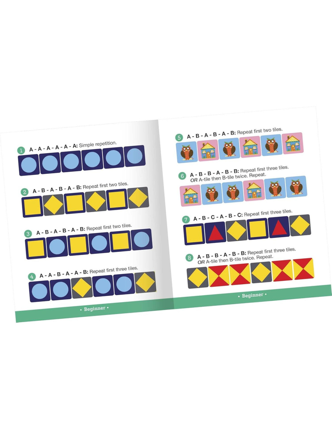 El set de Reconocimiento de Patrones ayuda a los niños a descubrir reglas para predecir secuencias y desarrollar aún más el pensamiento lógico, así como habilidades tempranas en matemáticas y lectura con tarjetas de patrones. Un gran ejercicio para el cerebro. El desafío comienza cuando un niño saca una tarjeta y comienza a duplicar y completar las piezas faltantes del patrón utilizando la bandeja y los azulejos para completar el patrón. El set incluye 60 azulejos ilustrados, una bandeja para colocar los azulejos, 40 tarjetas que están impresas en tres niveles de dificultad y un folleto de instrucciones.