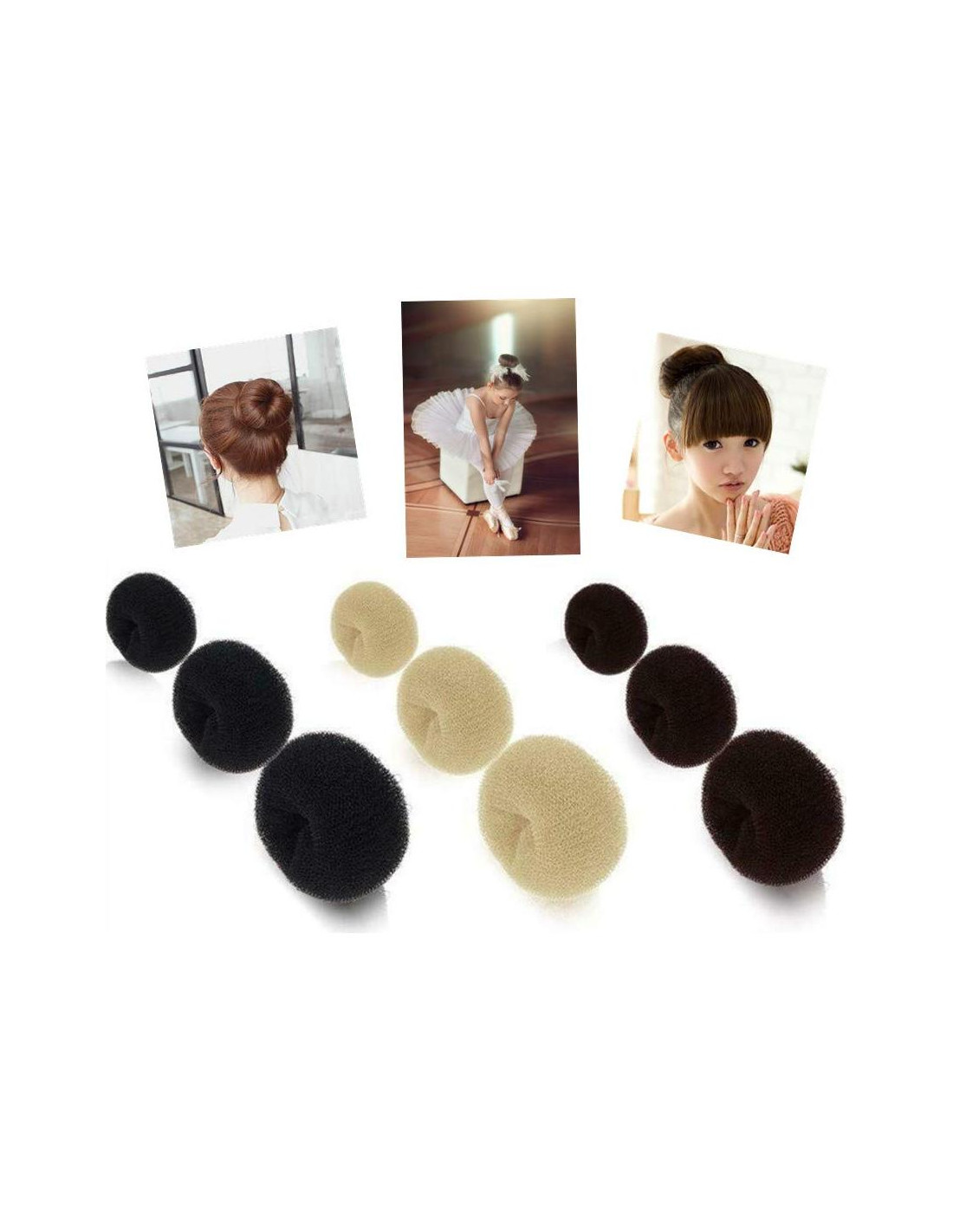 - [Juego de Fabricante de Moño] ---- El paquete de moño de dona viene con 3 colores (negro, beige, marrón) y 3 tamaños (grande, mediano, pequeño), un total de 18 piezas de fabricantes de moño de dona, adecuado para cabello grueso o delgado, un kit de estilización de moño de cabello perfecto para niños/niñas/niñas de cabello corto y delgado en ballet.