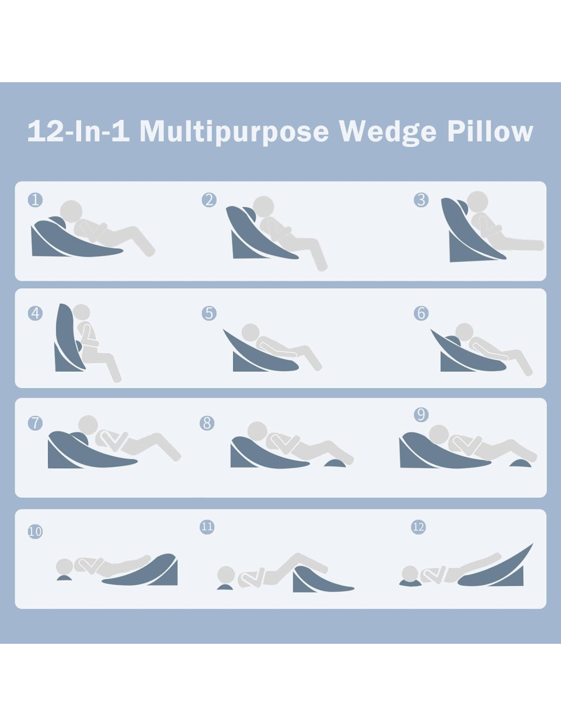 - DISEÑO MULTIFUNCIONAL 12 EN 1: El cojín en cuña para dormir ofrece más de 12 combinaciones diferentes. Además de las cuatro alturas comunes (10 pulgadas (25,4 cm), 12 pulgadas (30,48 cm), 18 pulgadas (45,72 cm) y 25 pulgadas (63,5 cm)), se puede ajustar libremente según las preferencias personales. El cojín en cuña es ideal para recuperarse de una cirugía, dormir de lado y de espaldas, y puede proporcionar un soporte cómodo mientras miras televisión o lees.