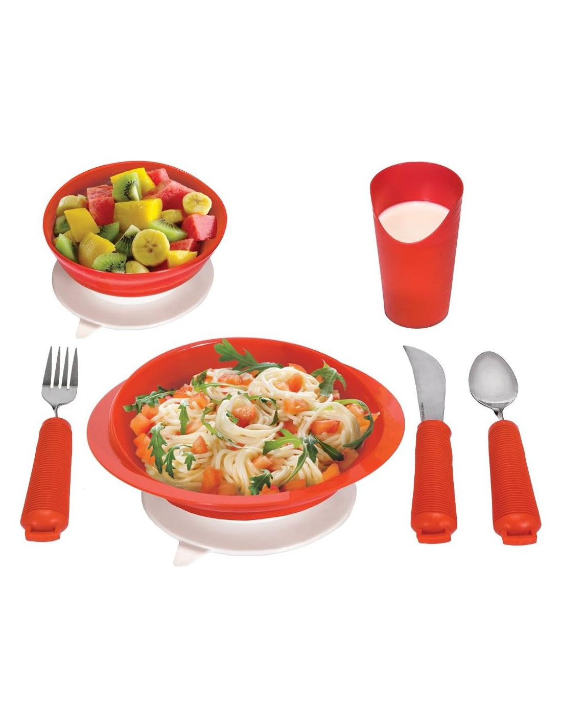 Elimina la frustración de comer mientras aumentas el consumo con el Juego de Vajilla Power of Red. Los estudios han demostrado que usar vajilla roja aumenta la ingesta de alimentos en individuos con Alzheimer y demencia al hacer más fácil ver y reconocer la comida. Los productos Power of Red muestran contraste entre la mesa, permitiendo al usuario reconocer más fácilmente lo que está comiendo. Además, cada producto también facilita la alimentación para individuos con habilidades motoras disminuidas. El set incluye 1 de cada uno de los Cuencos con Cuchara, Plato con Cuchara, Cuchillo Flexible, Tenedor Flexible, Cuchillo Rocker y Taza con Corte en la Nariz. El Cuenco y el Plato cuentan con una base de ventosa y un borde elevado que facilita la alimentación para cualquier persona. Los utensilios flexibles permiten una alimentación más fácil para cualquiera y tienen un mango agrandado para un uso más sencillo. Cada artículo es apto para lavavajillas para una fácil limpieza.