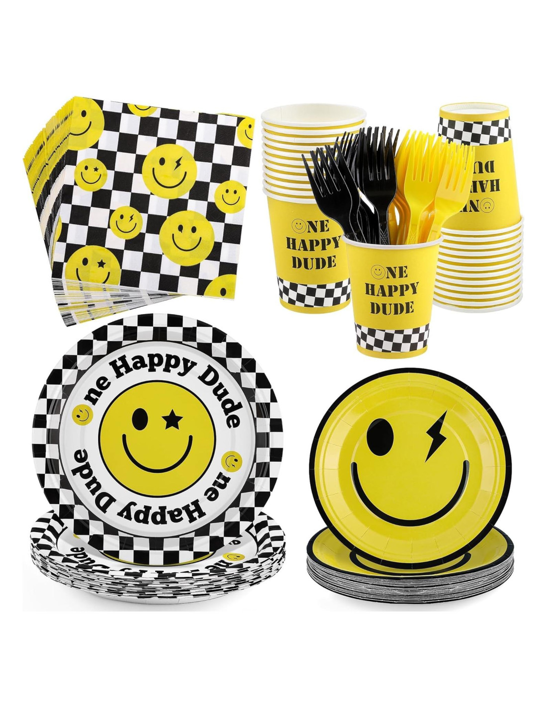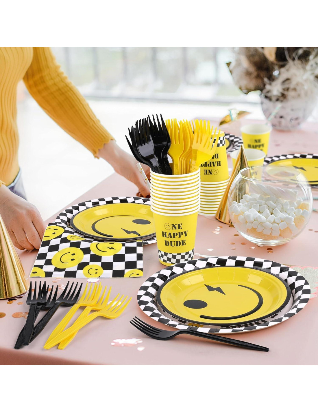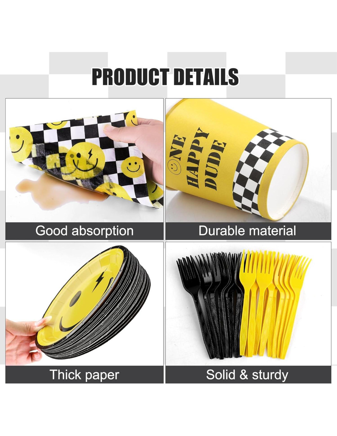 - Kit de fiesta completo: obtendrás 144 piezas de decoraciones para fiesta de un tipo feliz, incluyendo 48 platos de papel, 24 tenedores de plástico, 24 vasos de papel y 48 servilletas, cantidad suficiente para servir a 24 invitados