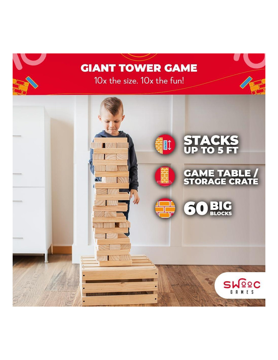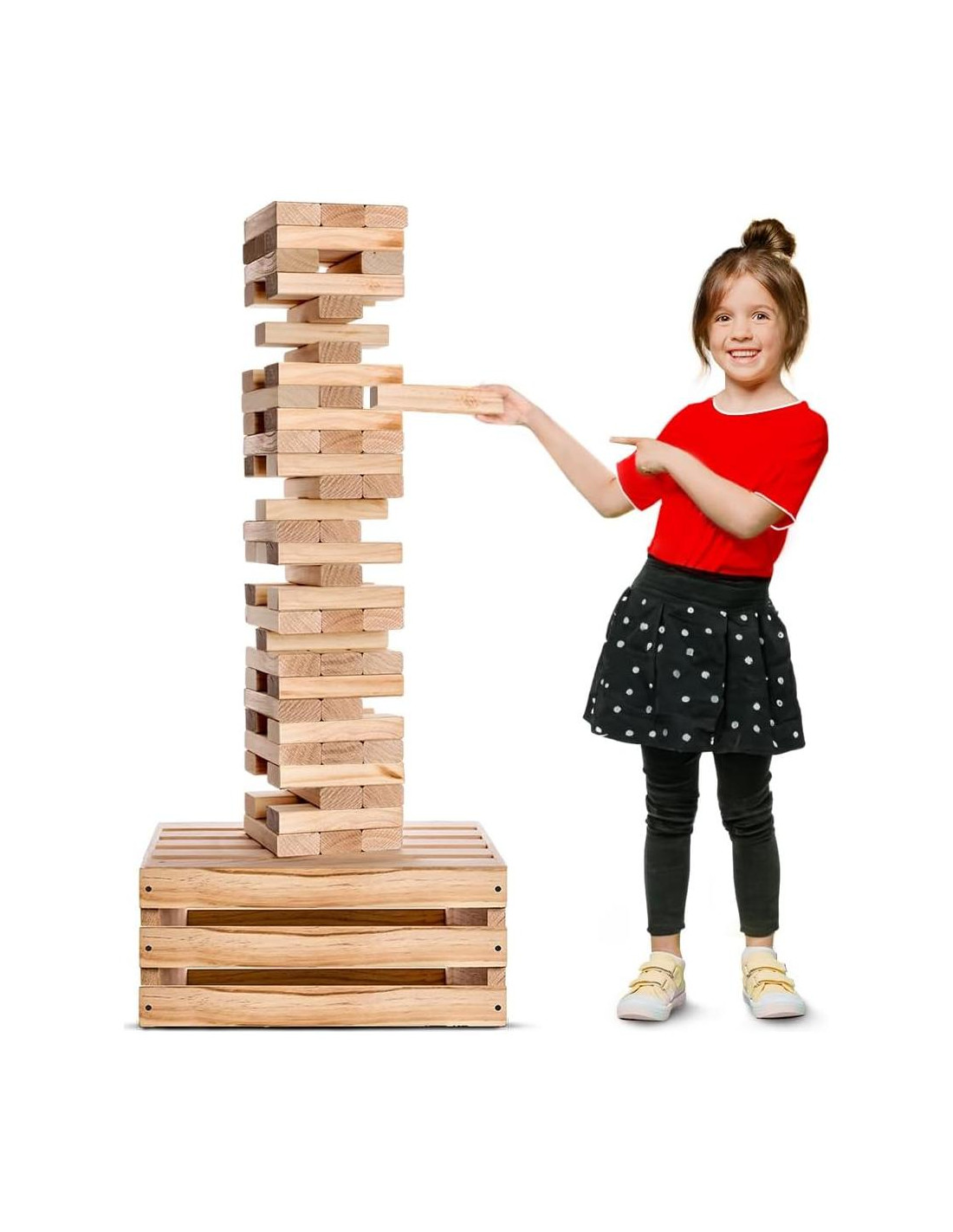 - 60 BLOQUES GIGANTES: Son 6 bloques extra en comparación con el juego de mesa clásico (Pista: Rima con Zenga). Comienza a más de 0.76m de altura (bloques de 61cm y mesa de juego de 20cm = 81cm en total). Altura máxima de 1.52m durante el juego; Cada bloque mide (L) 17.78cm x (W) 5.87cm x (H) 2.84cm