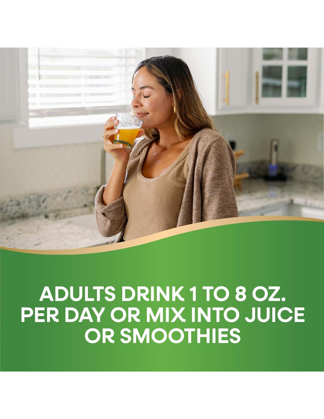- Los adultos beben de 1 a 8 oz. (29.57 a 236.59 ml) por día o mezclan en su jugo o batido favorito.