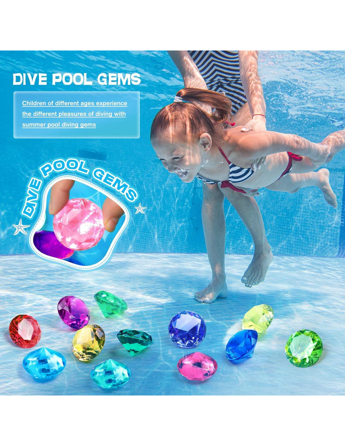 - Creatividad y Coraje: Las Gemas de Buceo pueden satisfacer las necesidades de niños de todas las edades, los juguetes de piscina fomentan que los niños pequeños intenten bucear, los niños mayores pueden jugar como sirenas o buzos y bucear para conseguir su tesoro! o incluso idear todo tipo de juegos de buceo, las gemas de joyería pueden ser un sistema de recompensas por trabajar juntos en ciertos comportamientos ideales.