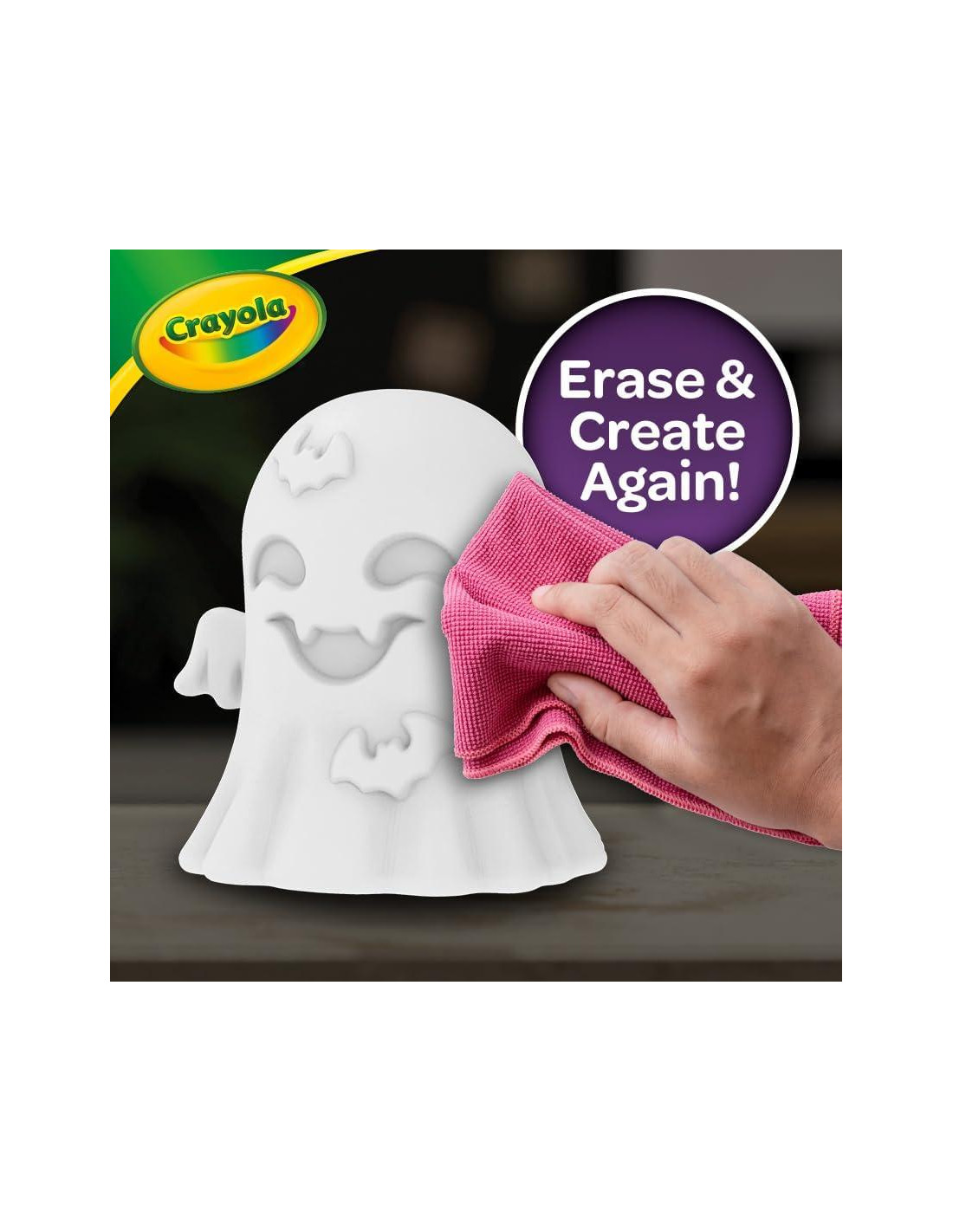 - DECORA TU FANTASMA: Dibuja tu diseño usando los Marcadores Lavables, activa el interruptor para iluminar tu fantasma, luego límpialo con un paño húmedo para comenzar de nuevo!