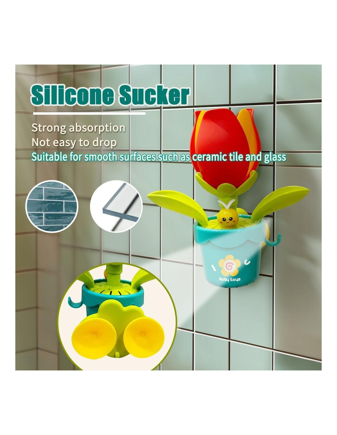 - Maceta de flores: Este juguete de baño para bebés con temática de jardín es perfecto para entretener a su hijo durante la ducha. La flor florecerá si la riega con la regadera del set