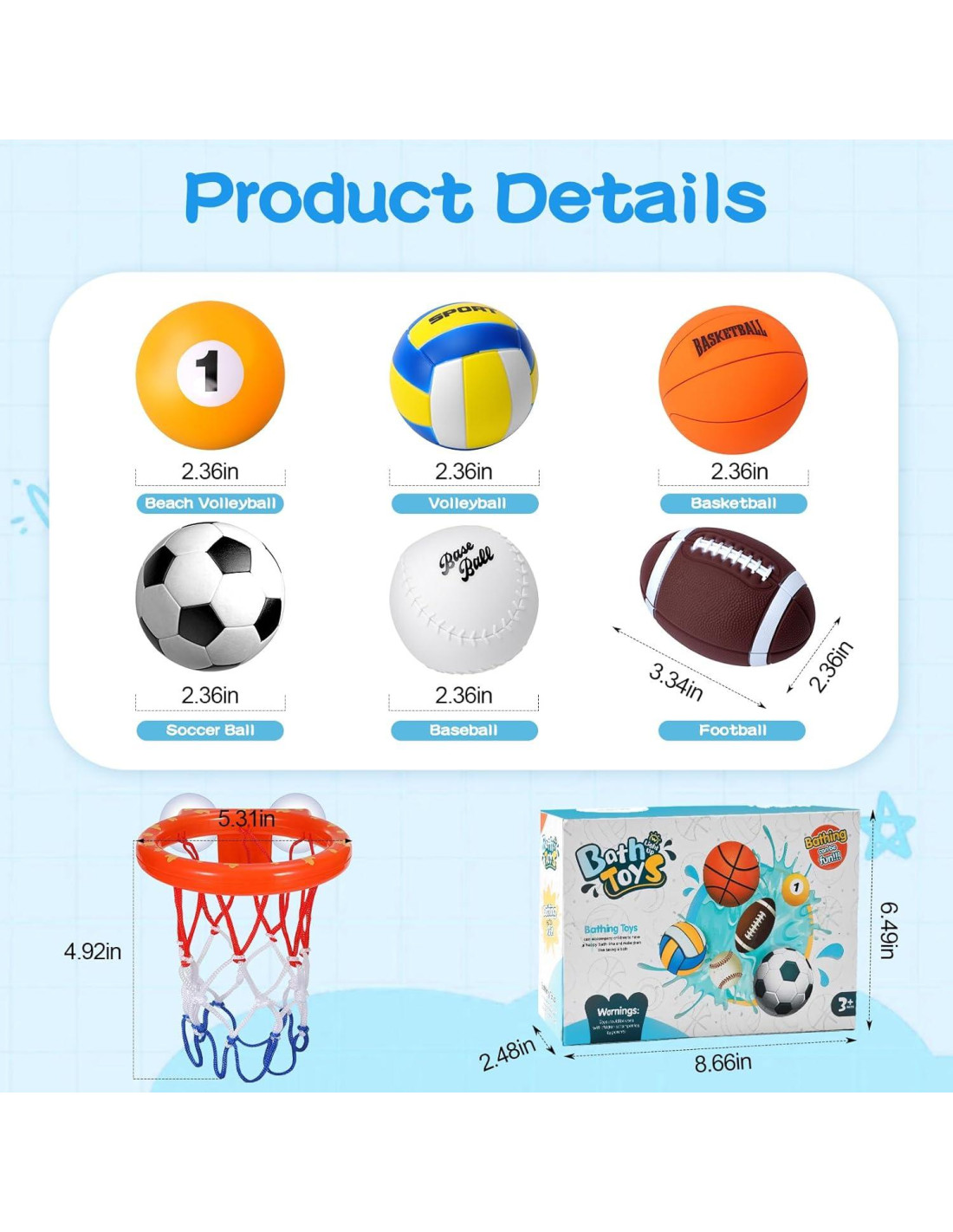 - Juguetes de baño iluminados: 6 bolas brillantes (fútbol, baloncesto, béisbol, voleibol, voleibol de playa, rugby) cuentan con luces LED a prueba de agua que parpadean colores divertidos al contacto con el agua. ¡Estos juguetes de agua iluminados flotan en la superficie, deleitando a los niños de 1 a 3 años mientras juegan durante la hora del baño!