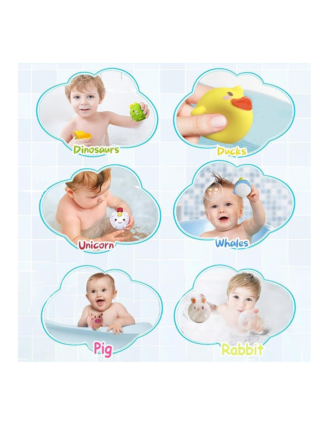 - Juego de 6PCS de juguetes de baño sin agujero: Descubre una colección encantadora de seis juguetes de baño con temática de animales: un unicornio mágico, una ballena juguetona, un dinosaurio feroz, un pato que hace cuac, un conejo saltarín y un adorable cerdo. Perfectos como juguetes de baño para bebés y niños pequeños, sus colores vibrantes y formas lindas son un éxito para juguetes de bebé de 12-18 meses, estas creaciones encantadoras seguramente serán un éxito en la bañera del bebé.