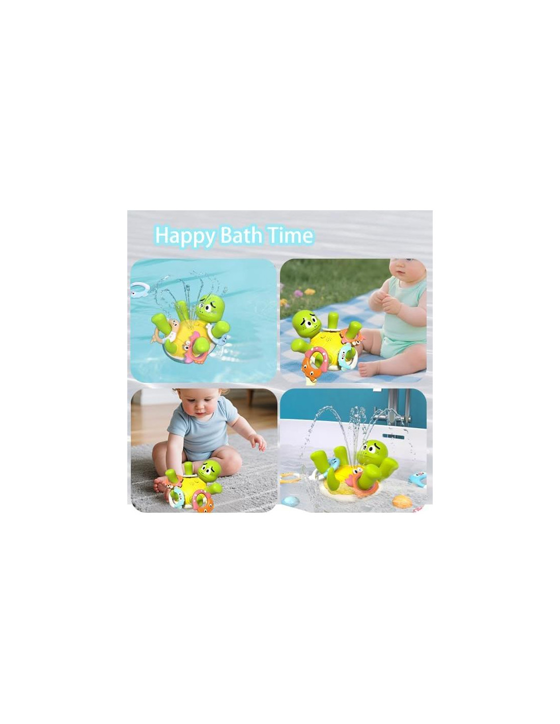 - Juguetes de baño rociadores geniales. ¡Mira cómo la hora del baño de los niños cobra vida! Los lindos juguetes de tortuga en la bañera crean un rociado de agua desde su barriga y giran en círculos mientras rocían agua. El bebé también puede poner aros de colores brillantes en las manos y pies de la tortuga, el bebé puede jugar a lanzar aros y más diversión para la hora del baño de los niños de 3 a 6 años.