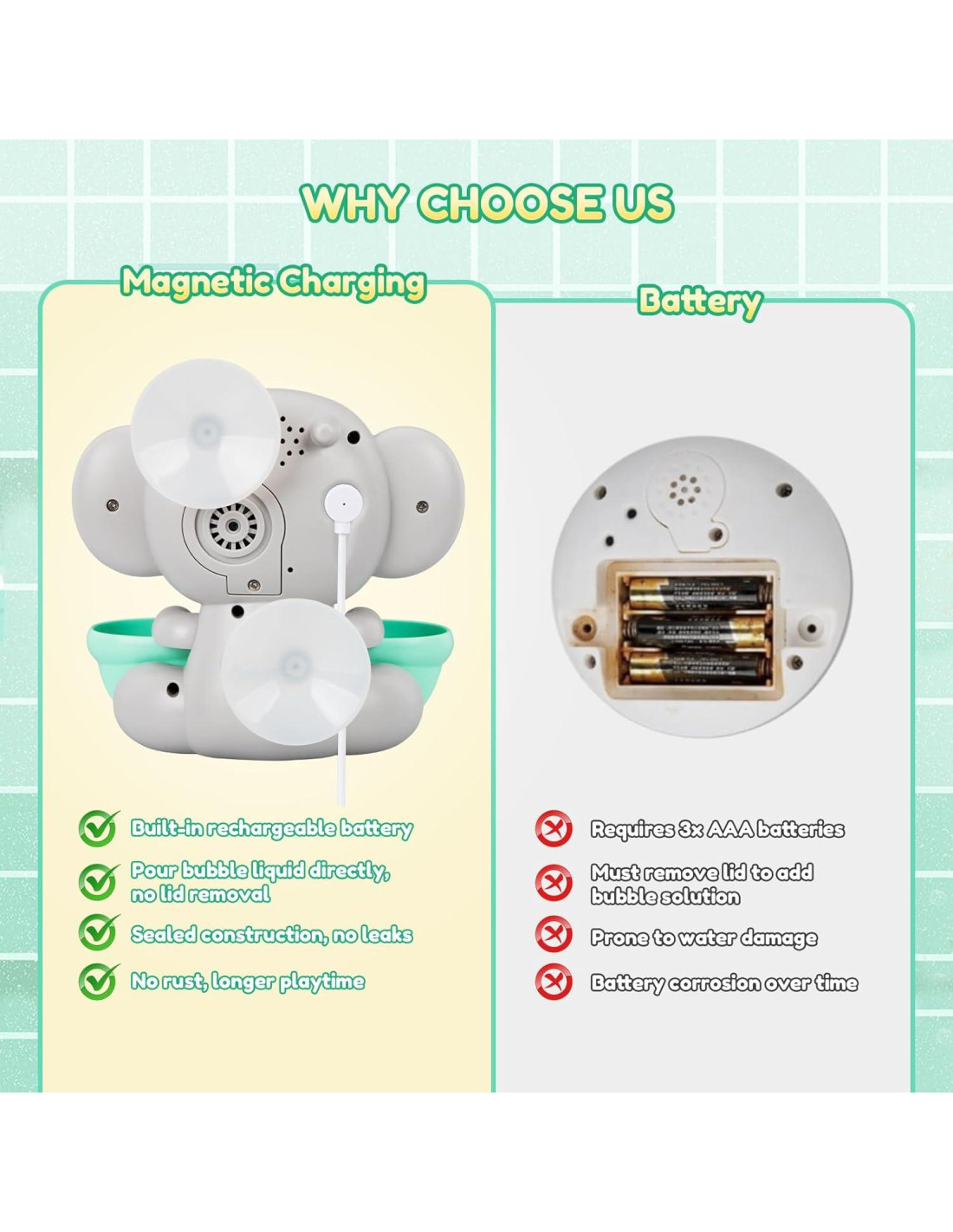 - Juguete de Burbujas Creativo: El lindo juguete de elefante en la bañera crea ricas burbujas para el entretenimiento del niño. La caja de burbujas abierta permite a los niños agregarla ellos mismos, aumentando la interactividad y la habilidad práctica, añadiendo más diversión a su tiempo de baño.