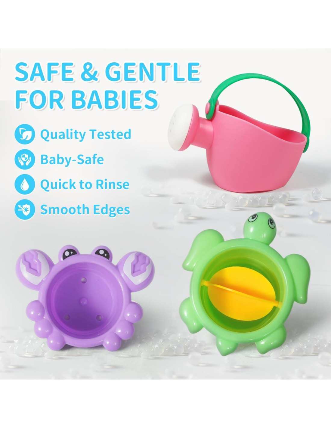 - Suaves, Seguros y Sin Preocupaciones: ¡Construidos para pequeños exploradores! Estos juguetes de baño ligeros pero duraderos son suaves al tacto y del tamaño perfecto para manos pequeñas. Sin partes complicadas - solo enjuagar, secar y jugar de nuevo. Lo suficientemente resistentes para salpicaduras, caídas y diversión diaria.