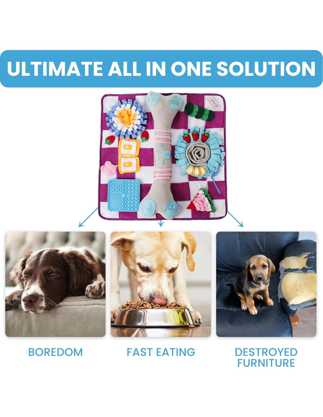 - MANTEN A TU PERRO OCUPADO Y ACTIVO: ¡Di adiós al aburrimiento con nuestra innovadora alfombra de olfateo para perros con almohadilla de lamido desmontable! Mantén a tu amigo peludo entretenido y contento, mientras reduces la ansiedad y fomentas un comportamiento positivo. El nuevo juguete favorito de tu cachorro ha llegado.
