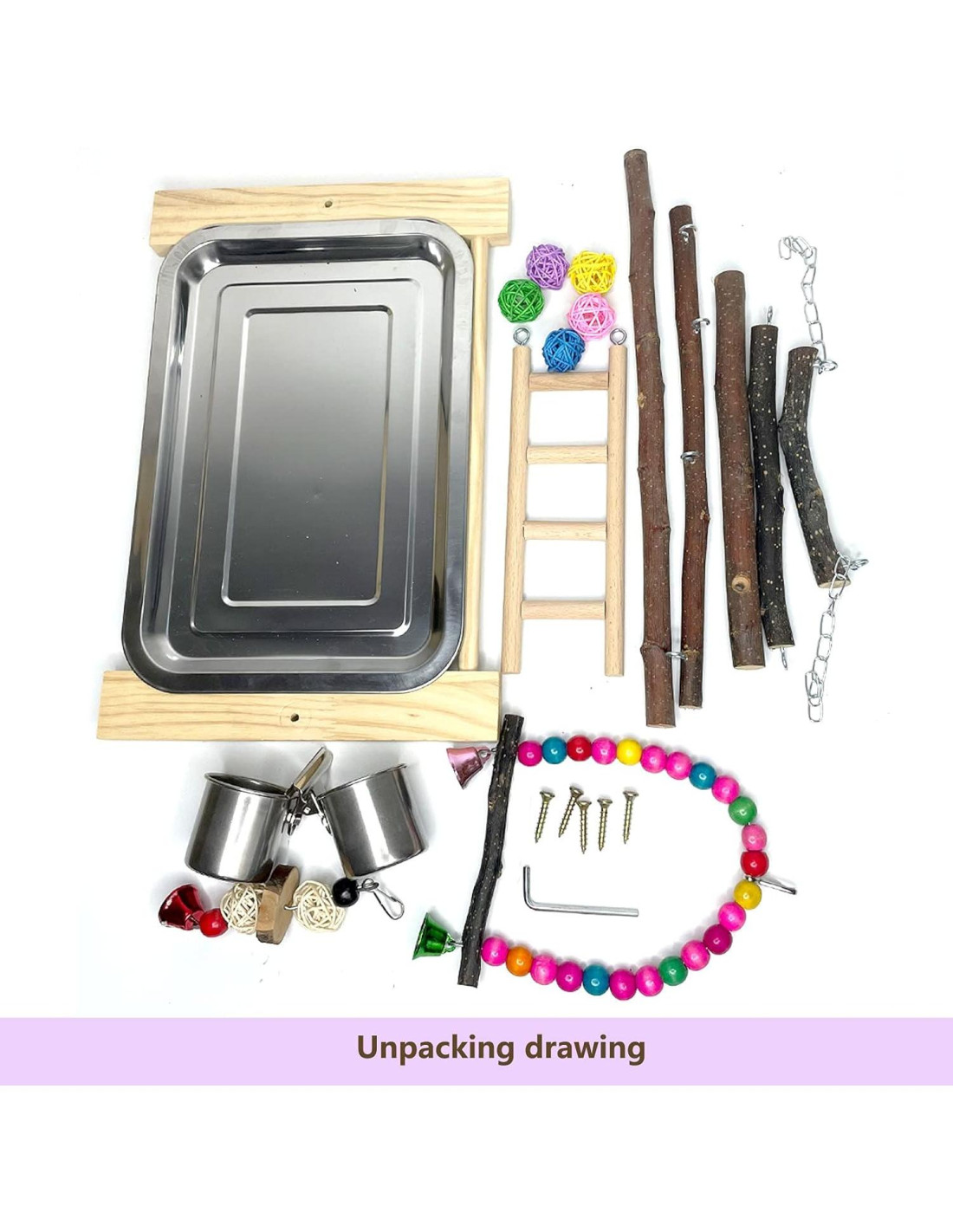 - [MATERIAL] El juguete para pájaros para periquitos está hecho de madera natural y hecho a mano, fuerte y duradero, los mascotas pueden usarlo con confianza. El chasis y los contenedores de comida están hechos de acero inoxidable y se pueden quitar para limpiar y secar. Todas las partes están conectadas con tornillos y no se utiliza pegamento, lo que hace que el soporte sea más estable. Proporciona más espacio de entrenamiento para tus pájaros