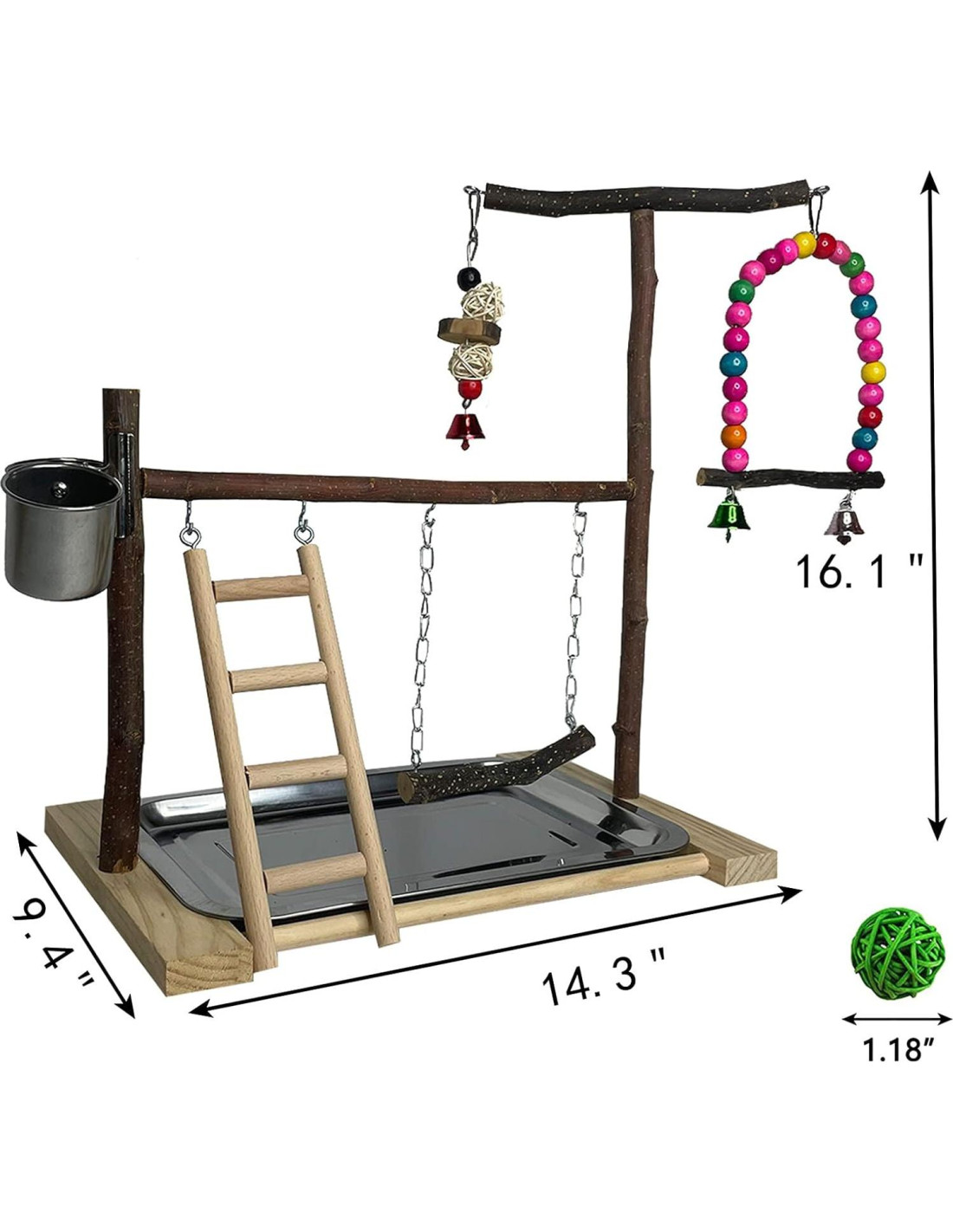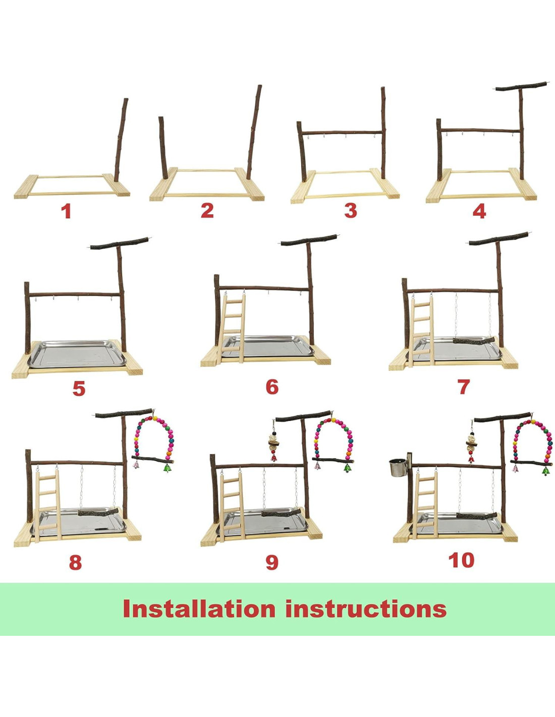 - [EMPAQUE Y TAMAÑO] La percha para pájaros consiste en un soporte para pájaros, cuatro tornillos, un destornillador, una bandeja, una escalera, un columpio, un juguete para morder, dos tazas de comida y cinco bolas de mimbre. El tamaño del soporte para pájaros es 36.3 cm x 23.9 cm x 40.9 cm (L x A x H). Necesitas ensamblar el soporte para pájaros tú mismo. Sigue los pasos en nuestro dibujo de instalación para ensamblar el marco para pájaros, solo coloca los tornillos en los agujeros, es muy simple. Si tienes algún problema con la instalación, contáctanos y estaremos encantados de ayudarte