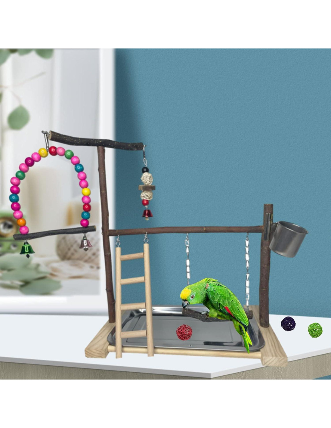 - [UN GRAN REGALO PARA TU PÁJARO] El gimnasio para pájaros es una plataforma para estimular el pensamiento de los pájaros, hacer ejercicio, jugar, alimentarse y descansar. Los juguetes de colores brillantes atraen la atención de los pájaros y alivian el aburrimiento. Puedes poner este parque de aves en tu escritorio u oficina, y cuando estés aburrido, puedes jugar con tus pájaros y disfrutar de la diversión y compañía que traen las mascotas